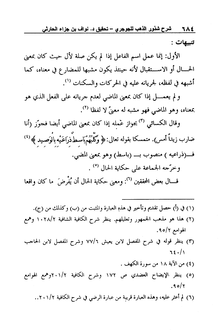 الأول: إنما عمل اسم الفاعل إذا لم يكن صلة لأل حيث كان بمعنى الحال أو الاستقبال لأنه حينئذ يكون مشبها للمضارع في معناه، كما أشبهه في لفظه، لجريانه عليه في الحركات والسكنات 1.