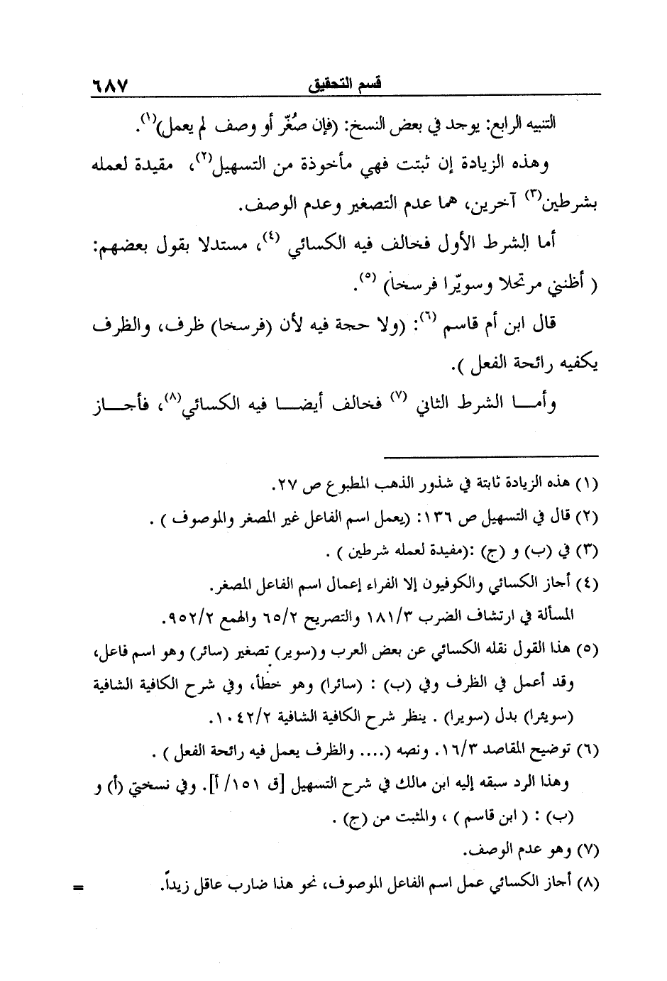 وهذه الزيادة إن ثبتت فهي مأخوذة من التسهيل2، مقيدة لعمله بشرطين3 آخرين، هما عدم التصغير وعدم الوصف.