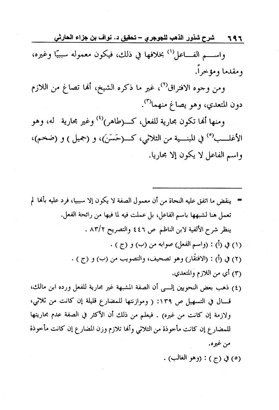 4 ذهب بعض النحويين إلى أن الصفة المشبهة غير مجارية للفعل ورده ابن مالك، قال في التسهيل ص 139: (وموازنتها للمضارع قليلة إن كانت من ثلاثي، ولازمة إن كانت من غيره) . فيعلم من ذلك أن الأكثر في الصفة عدم مجاريتها للمضارع إن كانت مأخوذة من الثلاثي وأنها تلازم وزن المضارع إن كانت مأخوذة من غيره.