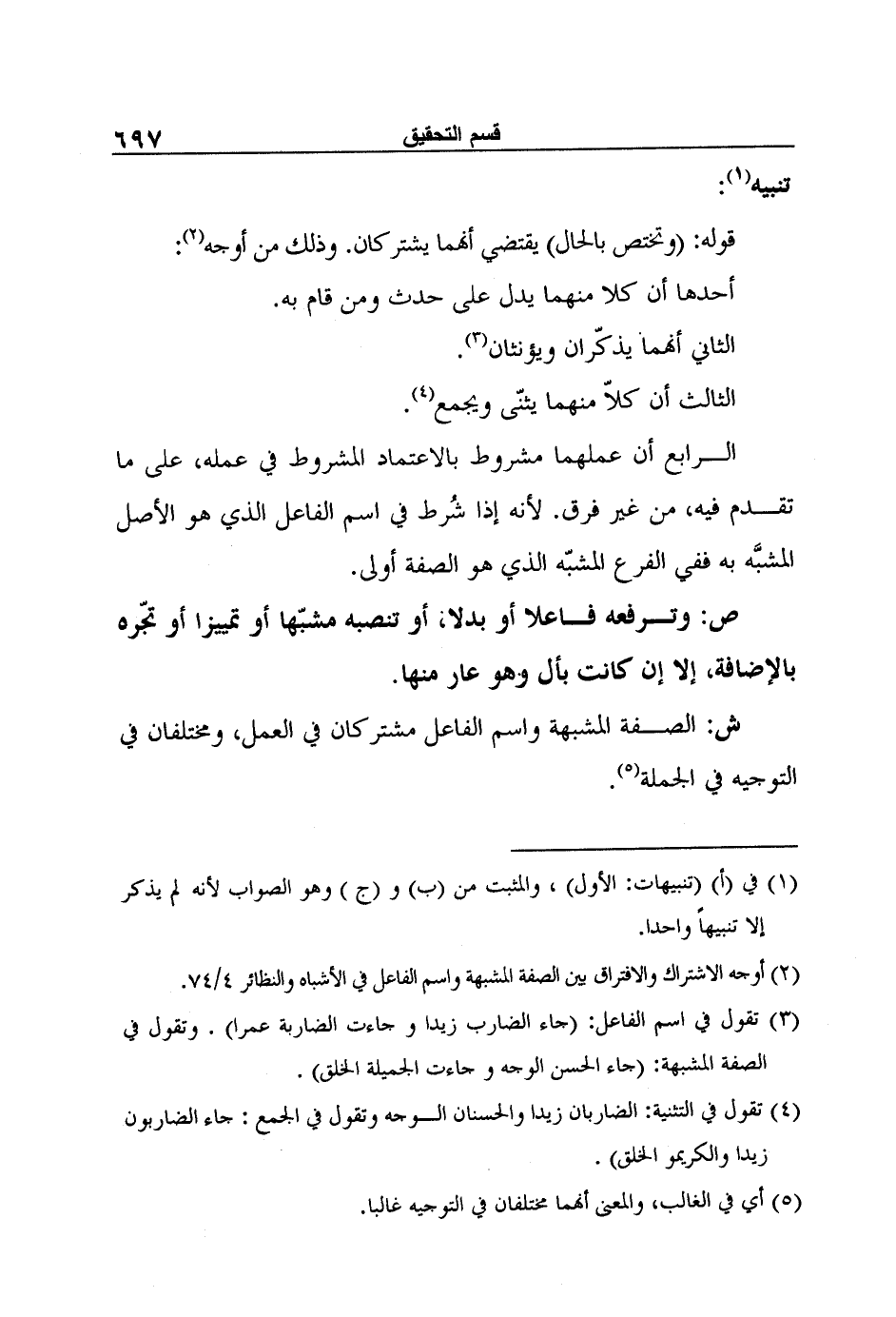 ش: الصفة المشبهة واسم الفاعل مشتركان في العمل، ومختلفان في التوجيه في الجملة5.