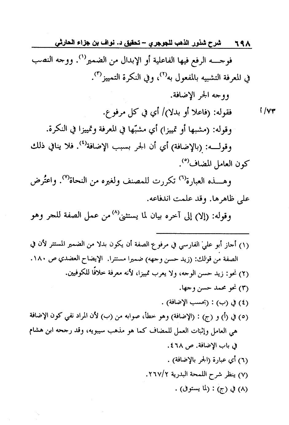 5 في (أ) و (ج) : (الإضافة) وهو خطأ، صوابه من (ب) لأن المراد نفي كون الإضافة هي العامل وإثبات العمل للمضاف كما هو مذهب سيبويه، وقد رجحه ابن هشام في باب الإضافة. ص 468.