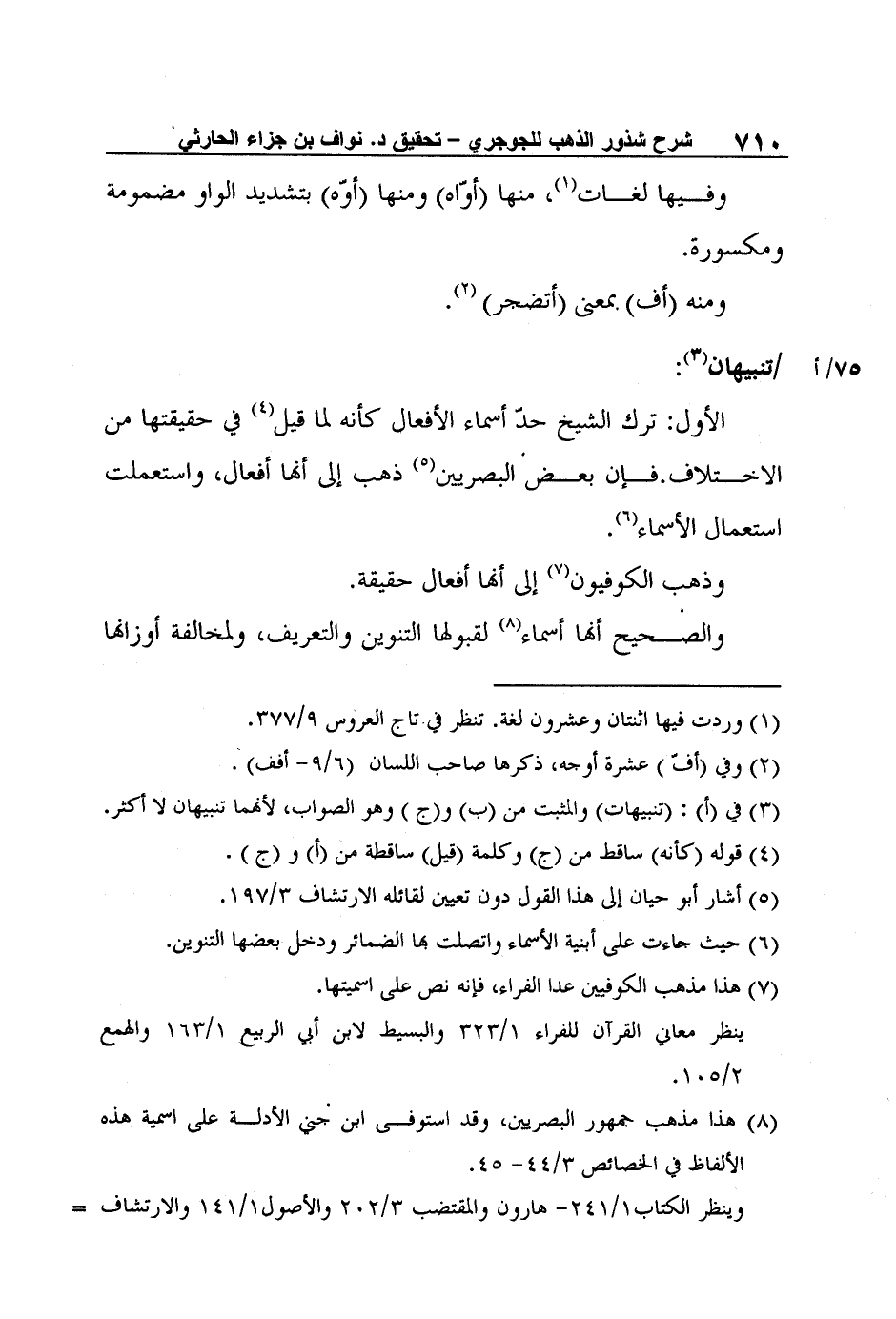 الأول: ترك الشيخ حدّ أسماء الأفعال كأنه لما قيل4 في حقيقتها من الاختلاف. فإن بعض البصريين5 ذهب إلى أنها أفعال، واستعملت استعمال الأسماء6.