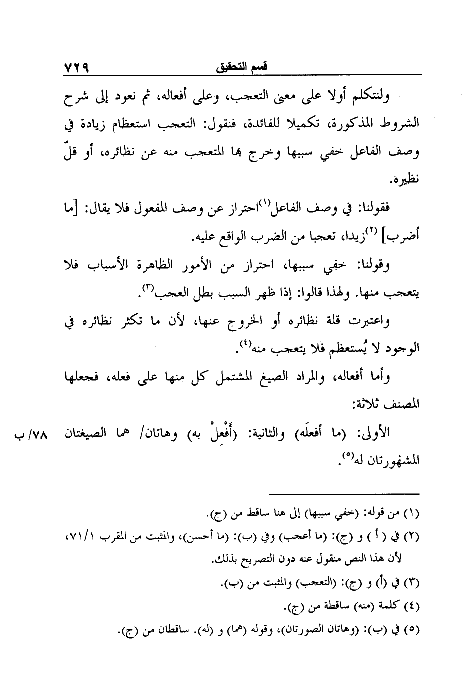 ولنتكلم أولا على معنى التعجب، وعلى أفعاله، ثم نعود إلى شرح الشروط المذكورة، تكميلا للفائدة، فنقول: التعجب استعظام زيادة في وصف الفاعل خفي سببها وخرج بها المتعجب منه عن نظائره، أو قلّ نظيره.