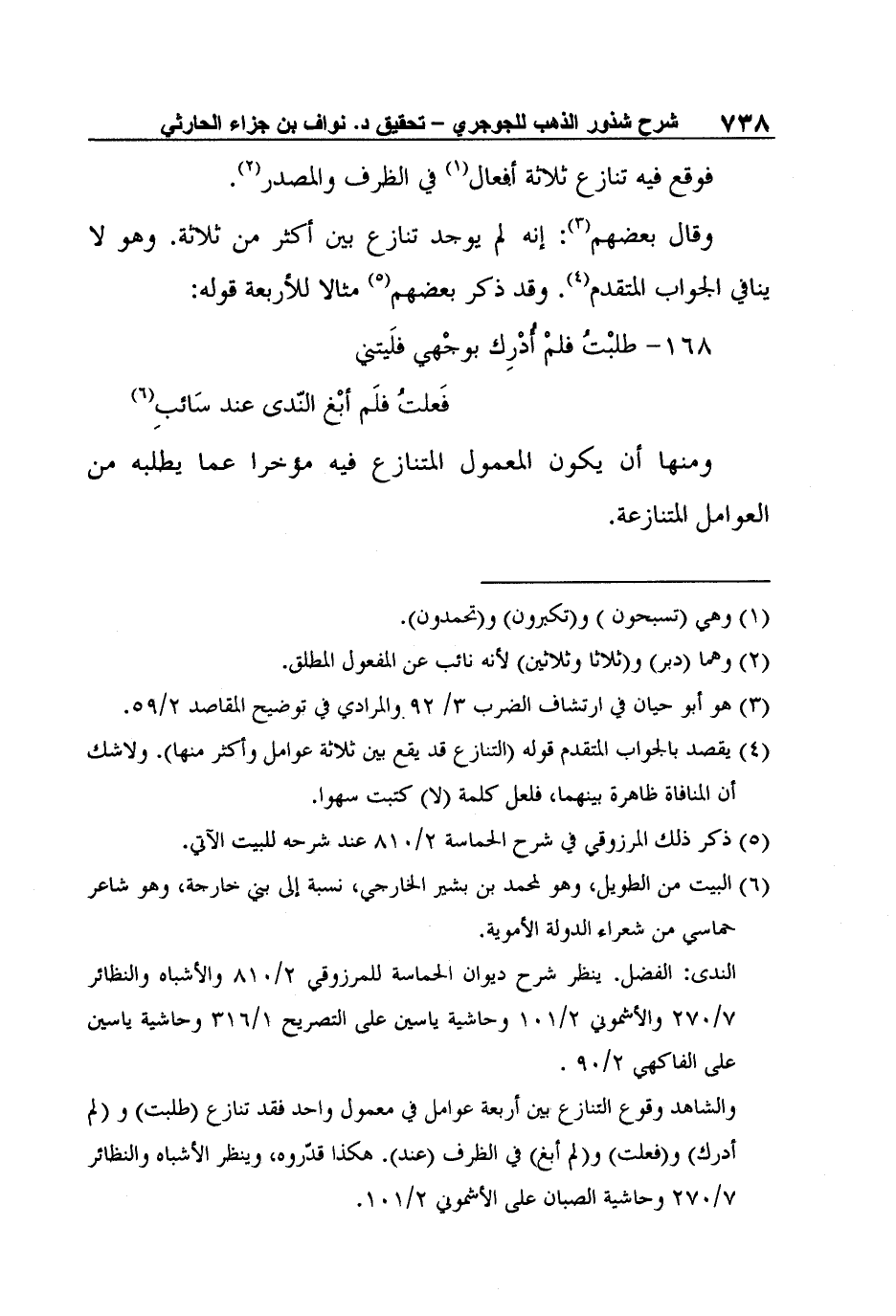 4 يقصد بالجواب المتقدم قوله (التنازع قد يقع بين ثلاثة عوامل وأكثر منها) . ولاشك أن المنافاة ظاهرة بينهما، فلعل كلمة (لا) كتبت سهوا.
