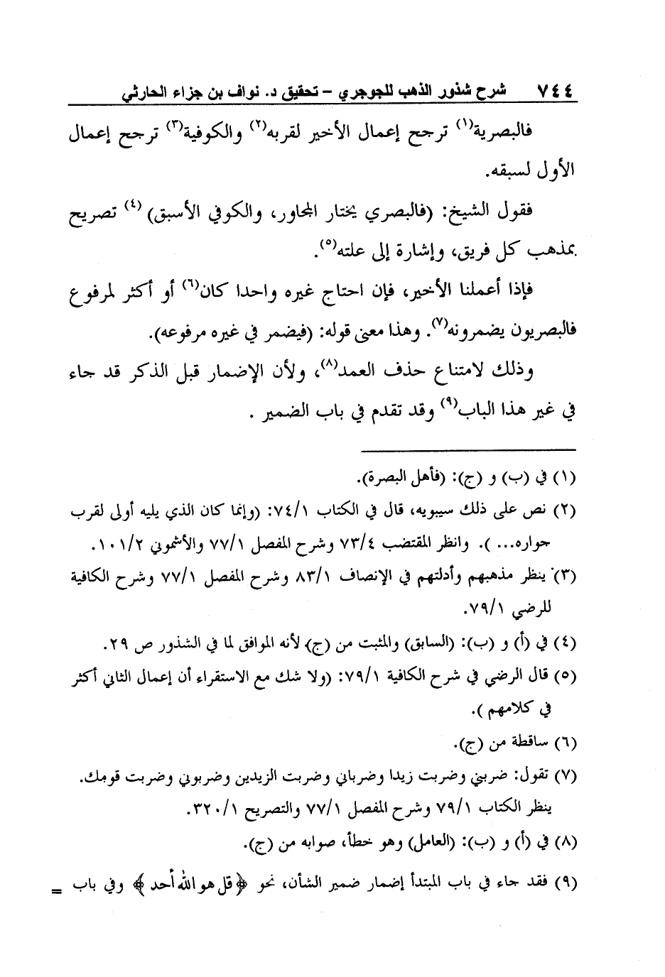 فالبصرية1 ترجح إعمال الأخير لقربه2 والكوفية3 ترجح إعمال الأول لسبقه.