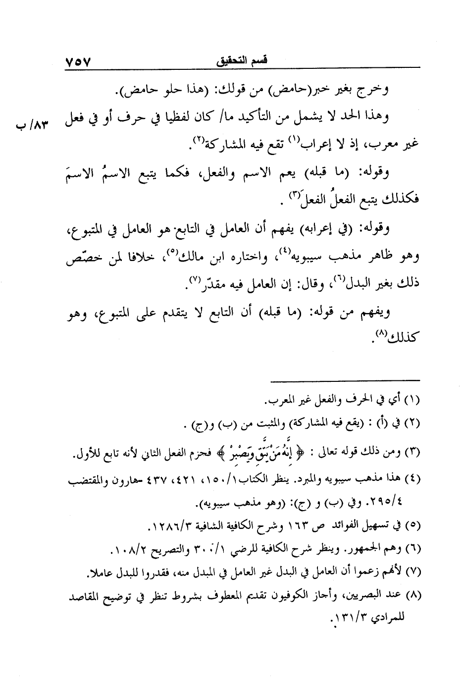وهذا الحد لا يشمل من التأكيد ما [83/ب] كان لفظيا في حرف أو في فعل غير معرب، إذ لا إعراب1 تقع فيه المشاركة2.