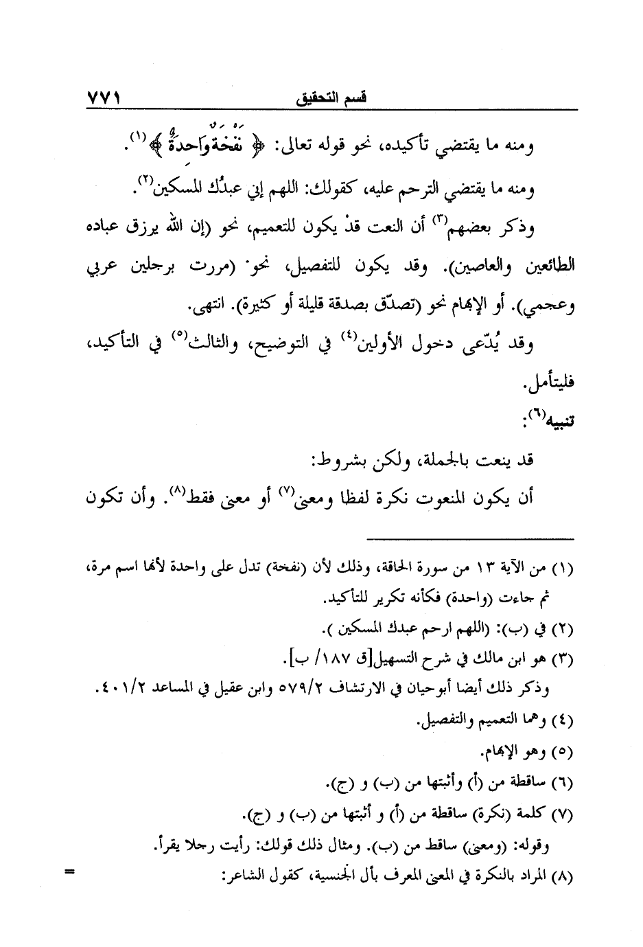 وذكر بعضهم3 أن النعت قد يكون للتعميم، نحو (إن الله يرزق عباده الطائعين والعاصين) . وقد يكون للتفصيل، نحو (مررت برجلين عربي وعجمي) . أو الإبهام نحو (تصدّق بصدقة قليلة أو كثيرة) . انتهى.