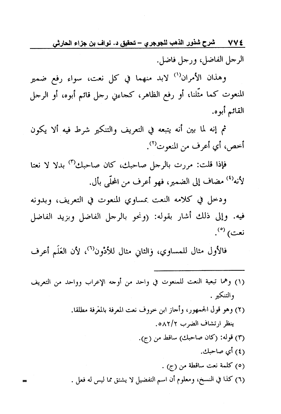 ودخل في كلامه النعت بمساوي المنعوت في التعريف، وبدونه فيه. وإلى ذلك أشار بقوله: (ونحو بالرجل الفاضل وبزيد الفاضل نعت) 5.