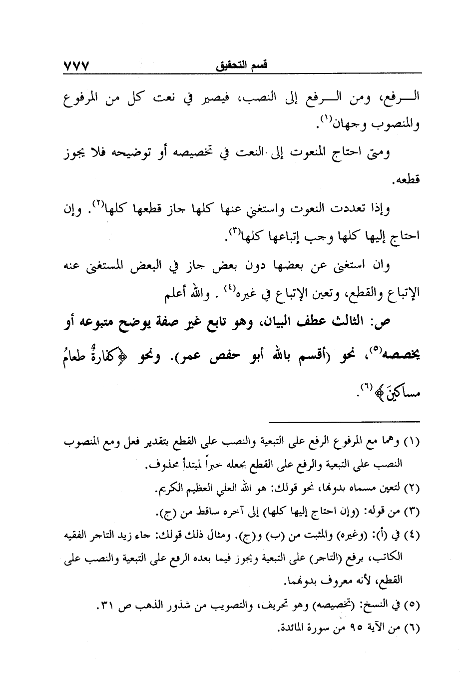 4 في (أ) : (وغيره) والمثبت من (ب) و (ج) . ومثال ذلك قولك: جاء زيد التاجر الفقيه الكاتب، برفع (التاجر) على التبعية ويجوز فيما بعده الرفع على التبعية والنصب على القطع، لأنه معروف بدونهما.