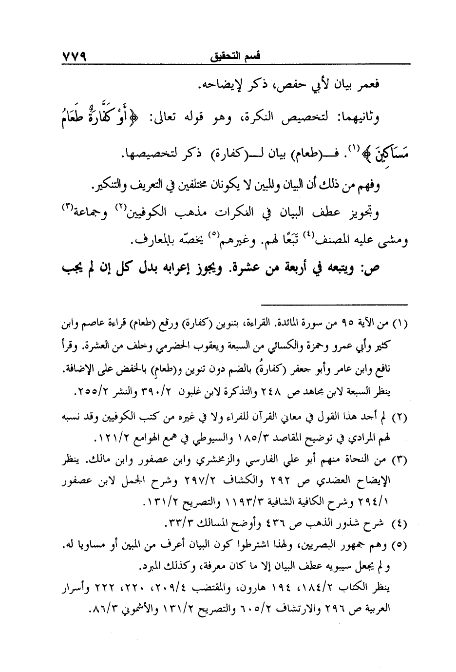 وثانيهما: لتخصيص النكرة، وهو قوله تعالى: {أَوْ كَفَّارَةٌ طَعَامُ مَسَاكِينَ} 1. ف (طعام) بيان ل (كفارة) ذكر لتخصيصها.