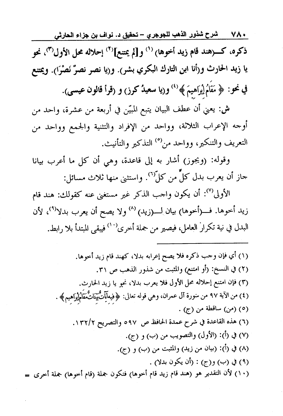ذكره، ك (هند قام زيد أخوها) 1 و [لم يمتنع] 2 إحلاله محل الأول3، نحو يا زيد الحارث و (أنا ابن التارك البكري بشر) . و (يا نصر نصرٌ نَصْرَا) . ويمتنع في نحو: {مَقَامُ إِبْرَاهِيمَ} 4 و (يا سعيدُ كرز) و (قرأ قالون عيسى) .