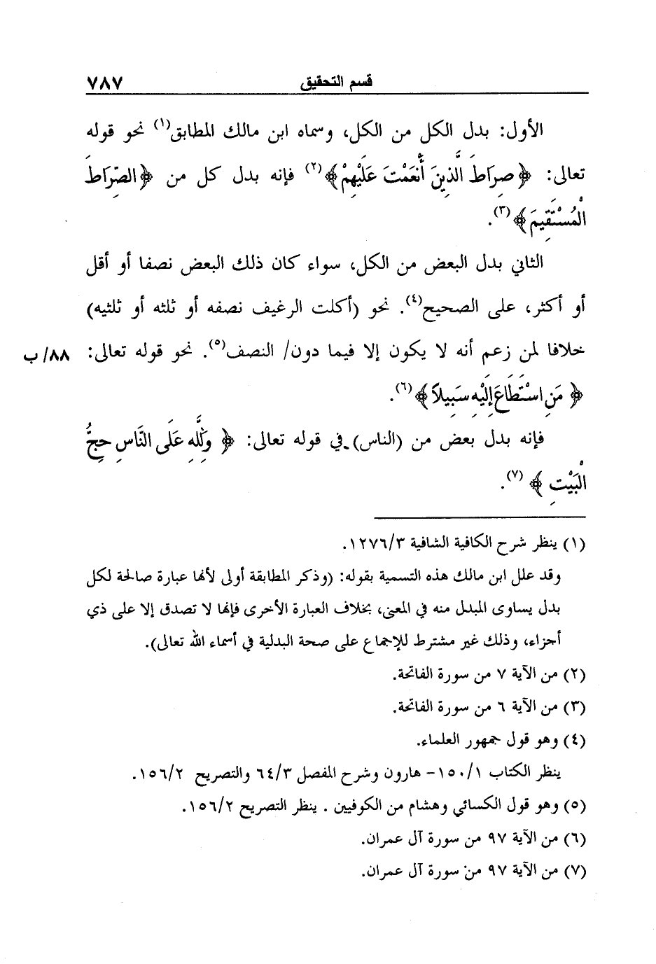 الأول: بدل الكل من الكل، وسماه ابن مالك المطابق1 نحو قوله تعالى: {صِرَاطَ الَّذِينَ أَنْعَمْتَ عَلَيْهِمْ} 2 فإنه بدل كل من {الصِّرَاطَ الْمُسْتَقِيمَ} 3.