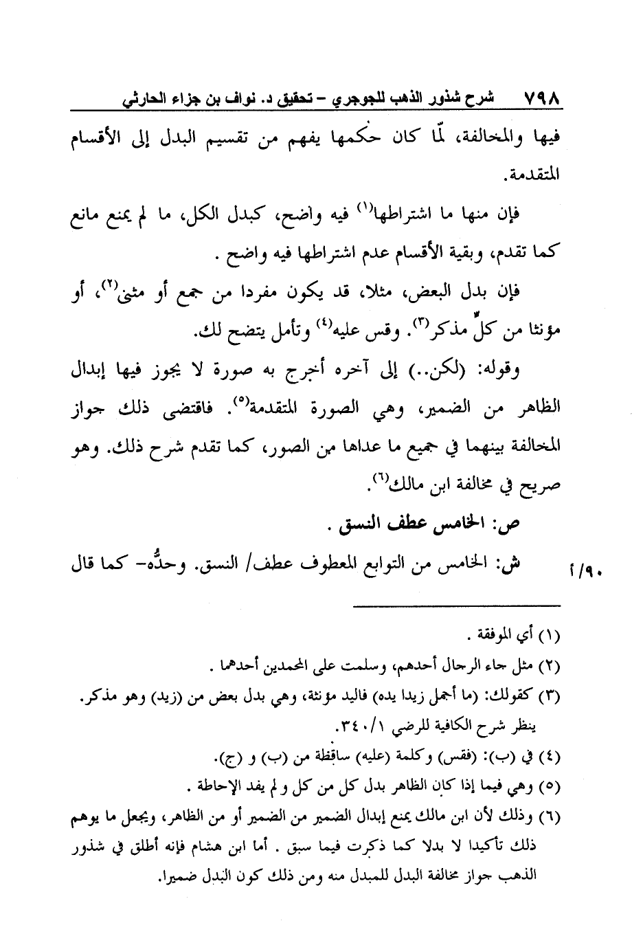 6 وذلك لأن ابن مالك يمنع إبدال الضمير من الضمير أو من الظاهر، ويجعل ما يوهم ذلك تأكيدا لا بدلا كما ذكرت فيما سبق. أما ابن هشام فإنه أطلق في شذور الذهب جواز مخالفة البدل للمبدل منه ومن ذلك كون البدل ضميرا.