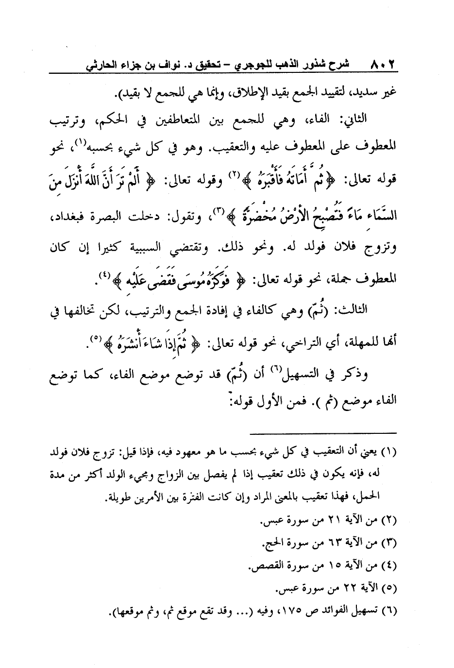 الثالث: (ثُمّ) وهي كالفاء في إفادة الجمع والترتيب، لكن تخالفها في أنها للمهلة، أي التراخي، نحو قوله تعالى: {ثُمَّ إِذَا شَاءَ أَنْشَرَهُ} 5.
