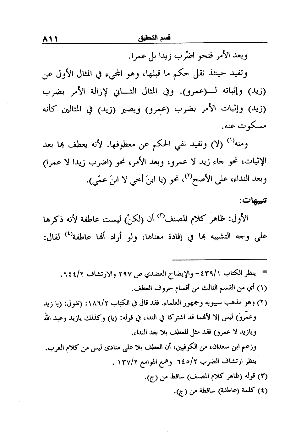 الأول: ظاهر كلام المصنف3 أن (لكنْ) ليست عاطفة لأنه ذكرها على وجه التشبيه بها في إفادة معناها، ولو أراد أنها عاطفة4 لقال: