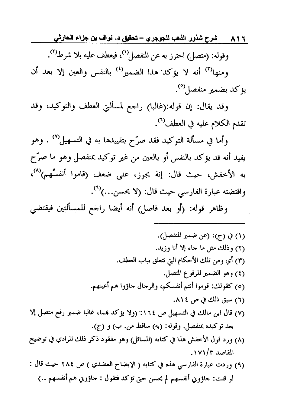 9 وردت عبارة الفارسي هذه في كتابه (الإيضاح العضدي) ص 284 حيث قال: لو قلت: جاؤوني أنفسهم لم يحسن حتى تؤكد فتقول: جاؤوني هم أنفسهم..)
