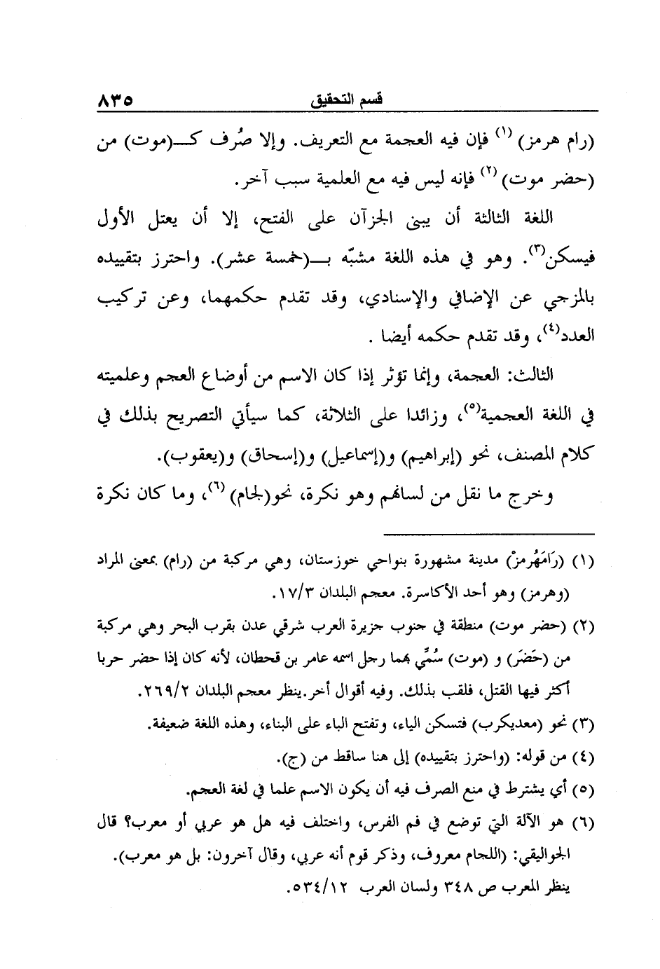 (رام هرمز) 1 فإن فيه العجمة مع التعريف. وإلا صُرف ك (موت) من (حضر موت) 2 فإنه ليس فيه مع العلمية سبب آخر.