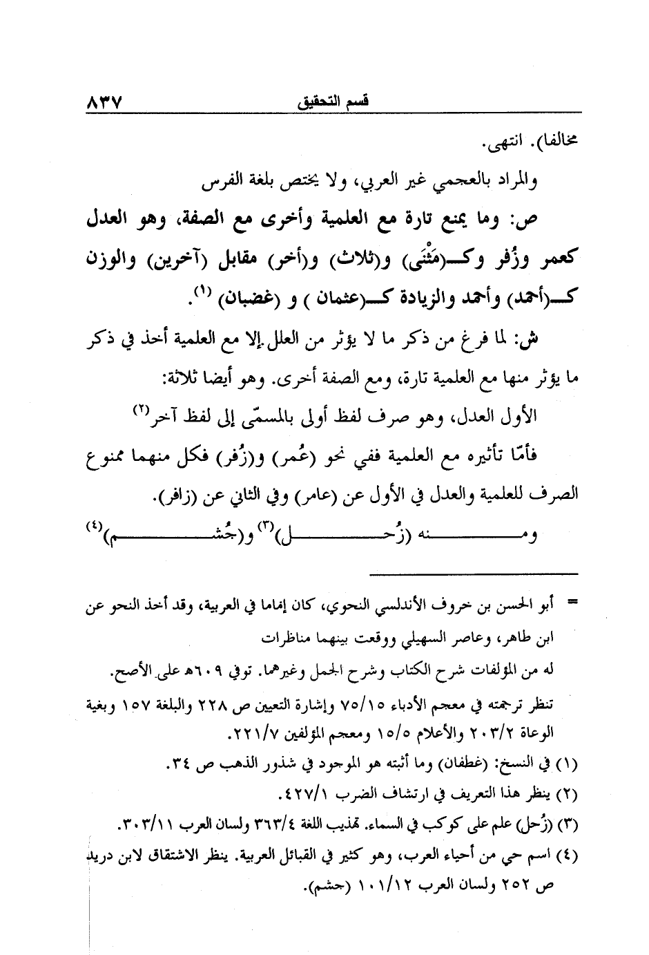 ص: وما يمنع تارة مع العلمية وأخرى مع الصفة، وهو العدل كعمر وزُفر وك (مَثْنَى) و (ثلاث) و (أخر) مقابل (آخرين) والوزن ك (أحمد) وأحمد والزيادة ك (عثمان) و (غضبان) 1.