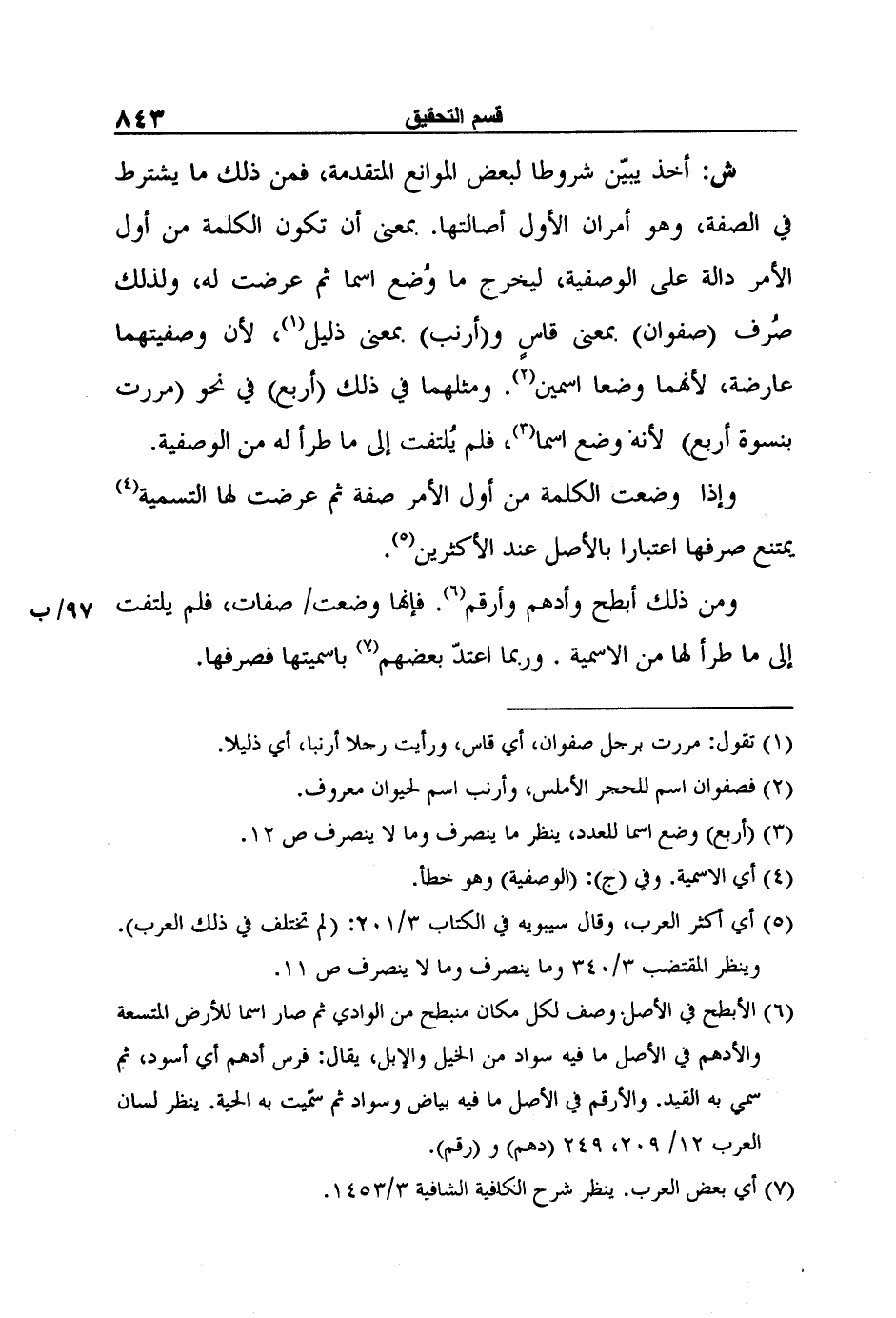 ش: أخذ يبيّن شروطا لبعض الموانع المتقدمة، فمن ذلك ما يشترط في الصفة، وهو أمران الأول أصالتها. بمعنى أن تكون الكلمة من أول الأمر دالة على الوصفية، ليخرج ما وُضع اسما ثم عرضت له، ولذلك صُرف (صفوان) بمعنى قاسٍ و (أرنب) بمعنى ذليل1، لأن وصفيتهما عارضة، لأنهما وضعا اسمين2. ومثلهما في ذلك (أربع) في نحو (مررت بنسوة أربع) لأنه وضع اسما3، فلم يُلتفت إلى ما طرأ له من الوصفية.