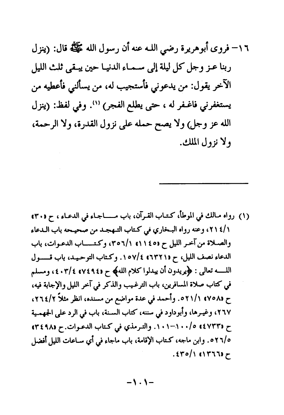16 ـ فروى أبو هريرة رضي الله عنه أن رسول الله صلى الله عليه وسلم قال: " ينزل ربنا عز وجل كل ليلة إلى سماء الدنيا حين يبقى ثلث الليل الآخر يقول: من يدعوني فأستجيب له، من يسألني فأعطيه من يستغفرني فأغفر له، حتى يطلع الفجر " 1. وفي لفظ: " ينزل الله عز وجل " ولا يصح حمله على نزول القدرة، ولا الرحمة ولا نزول الملك.