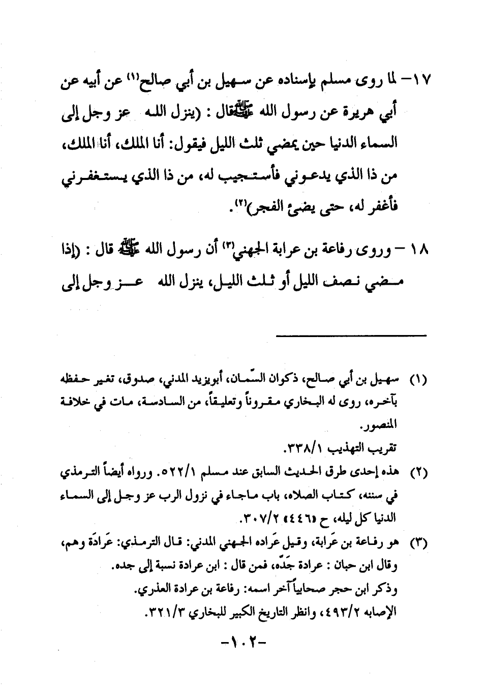17 ـ لما روى مسلم بإسناده عن سهيل بن أبي صالح1 عن أبيه عن أبي هريرة عن رسول الله صلى الله عليه وسلم قال: " ينزل الله عز وجل إلى السماء الدنيا حين يمضي ثلث الليل فيقول: أنا الملك، أنا الملك، من ذا الذي يدعوني فأستجيب له، من ذا الذي يستغفرني فأغفر له، حتى يضئ الفجر " 2.
