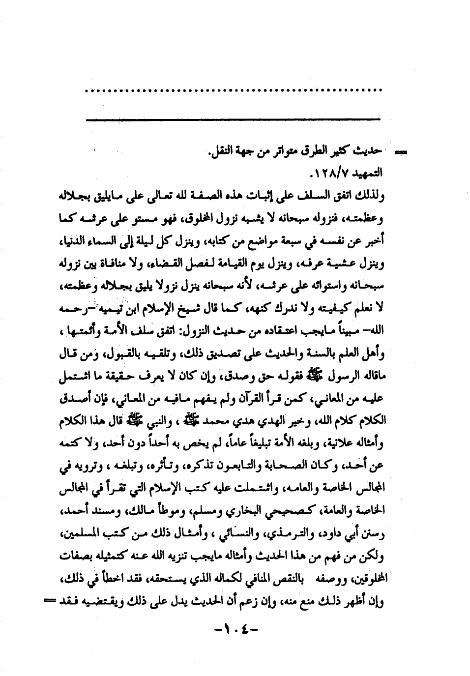 ولذلك اتفق السلف على إثبات هذه الصفة لله تعالى على ما يليق بجلاله وعظمته، فنزوله سبحانه لا يشبه نزول المخلوق، فهو مستو على عرشه كما أخبر عن نفسه في سبعة مواضع من كتابه، وينزل كل ليلة إلى السماء الدنيا، وينزل عشية عرفة، وينزل يوم القيامة لفصل القضاء، ولا مناقاة بين نزوله سبحانه واستوائه على عرشه، لأنه سبحانه ينزل نزولاً يليق بجلاله وعظمته، لا نعلم كيفيته ولا ندرك كنهه، كما قال شيخ الإسلام ابن تيمية ـ رحمه الله ـ مبيناً ما يجب اعتقاده من حديث النزول: " اتفق سلف الأمة وأئمتها، وأهل العلم بالسنة والحديث على تصديق ذلك، وتلقيه بالقبول، ومن قال ما قاله الرسول صلى الله عليه وسلم فقوله حق وصدق، وإن كان لا يعرف حقيقة ما اشتمل عليه من المعاني، كمن قرأ القرآن ولم يفهم ما فيه من المعاني، فإن أصدق الكلام كلام الله، وخير الهدي هدي محمد صلى الله عليه وسلم، والنبي صلى الله عليه وسلم قال هذا الكلام وأمثاله علانية، وبلغه الأمة تبليعاً عاماً، لم يخص به أحداً دون أحد، ولا كتمه عن أحد، وكان الصحابة والتابعون تذكره، وتأثره، وتبلغه، وترويه في المجالس الخاصة والعامة، واشتملت عليه كتب الإسلام التي تقرأ في المجالس الخاصة والعامة، كصحيحي البخاري ومسلم، وموطأ مالك، ومسند أحمد، وسنن أبي داود، والترمذي، والنسائي، وأمثال ذلك من كتب المسلمين، ولكن من فهم من هذا الحديث وأمثاله ما يجب تنزيه الله عنه كتمثيله بصفات المخلوقين، ووصفه بالنقص المنافي لكماله الذي يستحقه، فقد