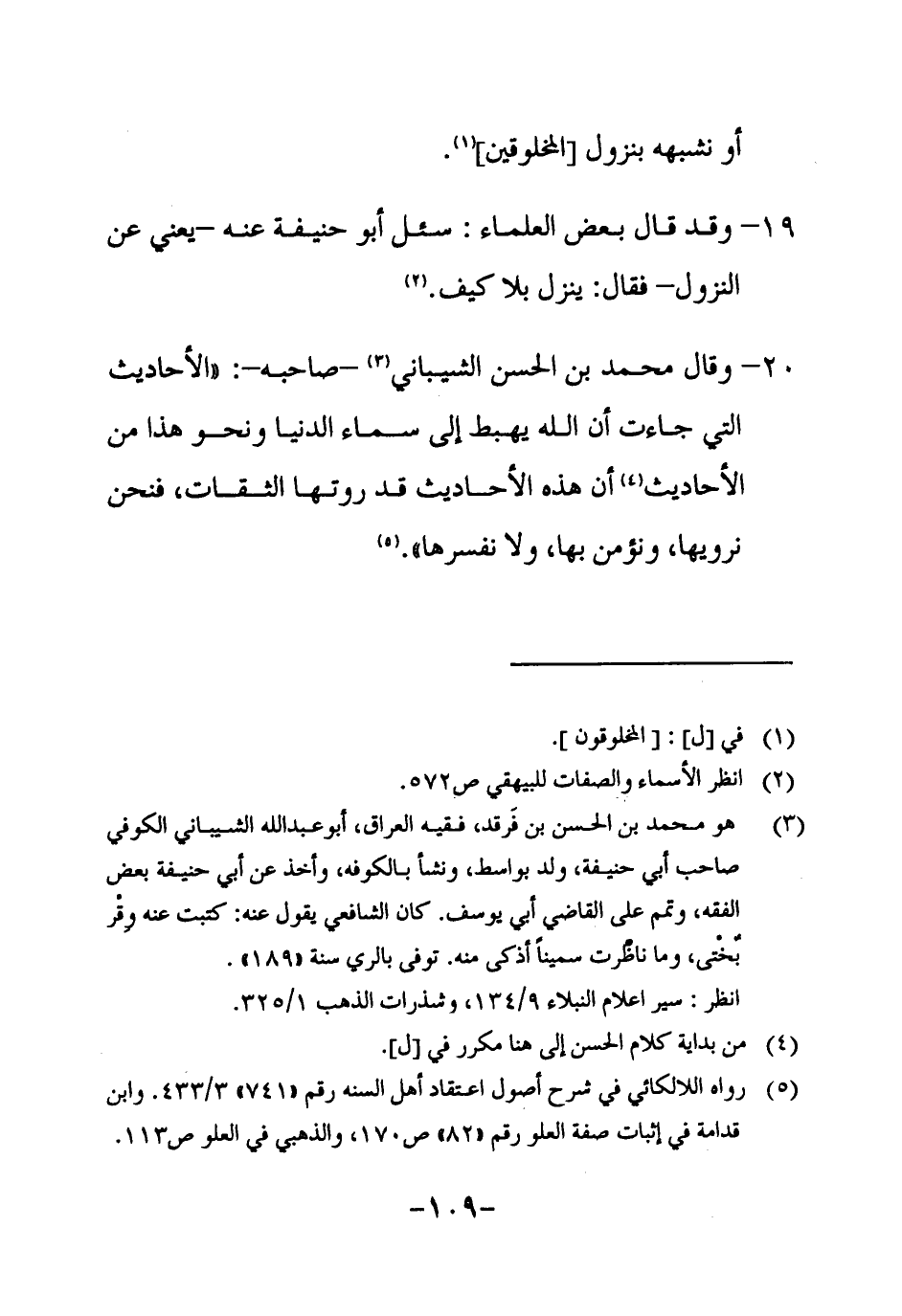 20 ـ وقال محمد بن الحسن الشيباني3 ـ صاحبه ـ: " الأحاديث التي جاءت أن الله يهبط إلى سماء الدنيا ونحو هذا من الأحاديث4 أن هذه الأحاديث قد روتها الثقات، فنحن نرويها، ونؤمن بها، ولا نفسرها "5.
