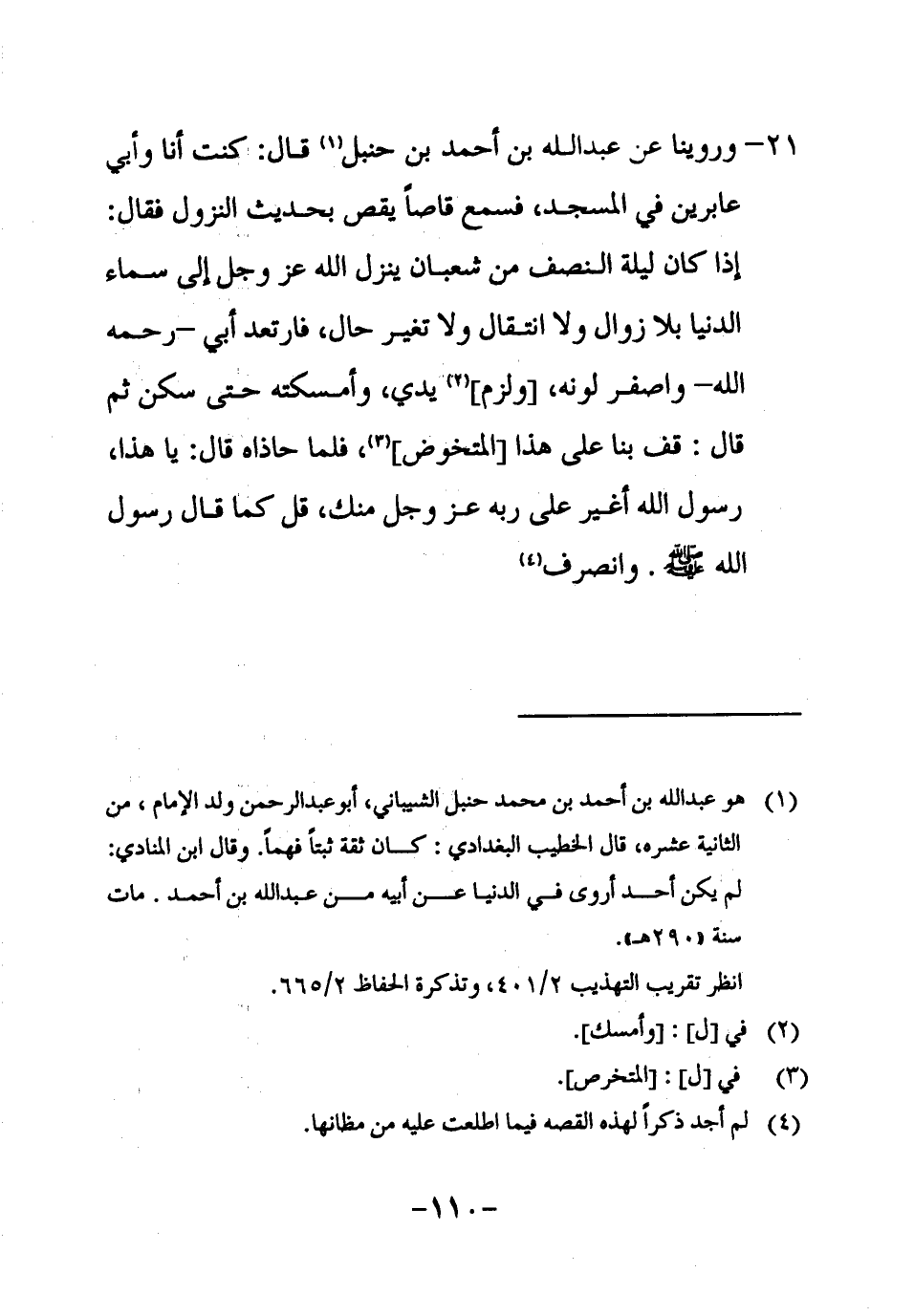 21 ـ وروينا عن عبد الله بن أحمد بن حنبل1 قال: كنت أنا وأبي عابرين في المسجد، فسمع قاصاً يقص بحديث النزول فقال: إذا كان ليلة النصف من شعبان ينزل الله عز وجل إلى سماء الدنيا بلا زوال ولا انتقال ولا تغير حال، فارتعد أبي ـ رحمه الله ـ واصفر لونه، [ولزم] 2 يدي، وأمسكته حتى سكن ثم قال: قف بنا على هذا [المتخوض] 3، فلما حاذاه قال: يا هذا، رسول الله أغير على ربه عز وجل منك، قل كما قال رسول الله صلى الله عليه وسلم. وانصرف4.