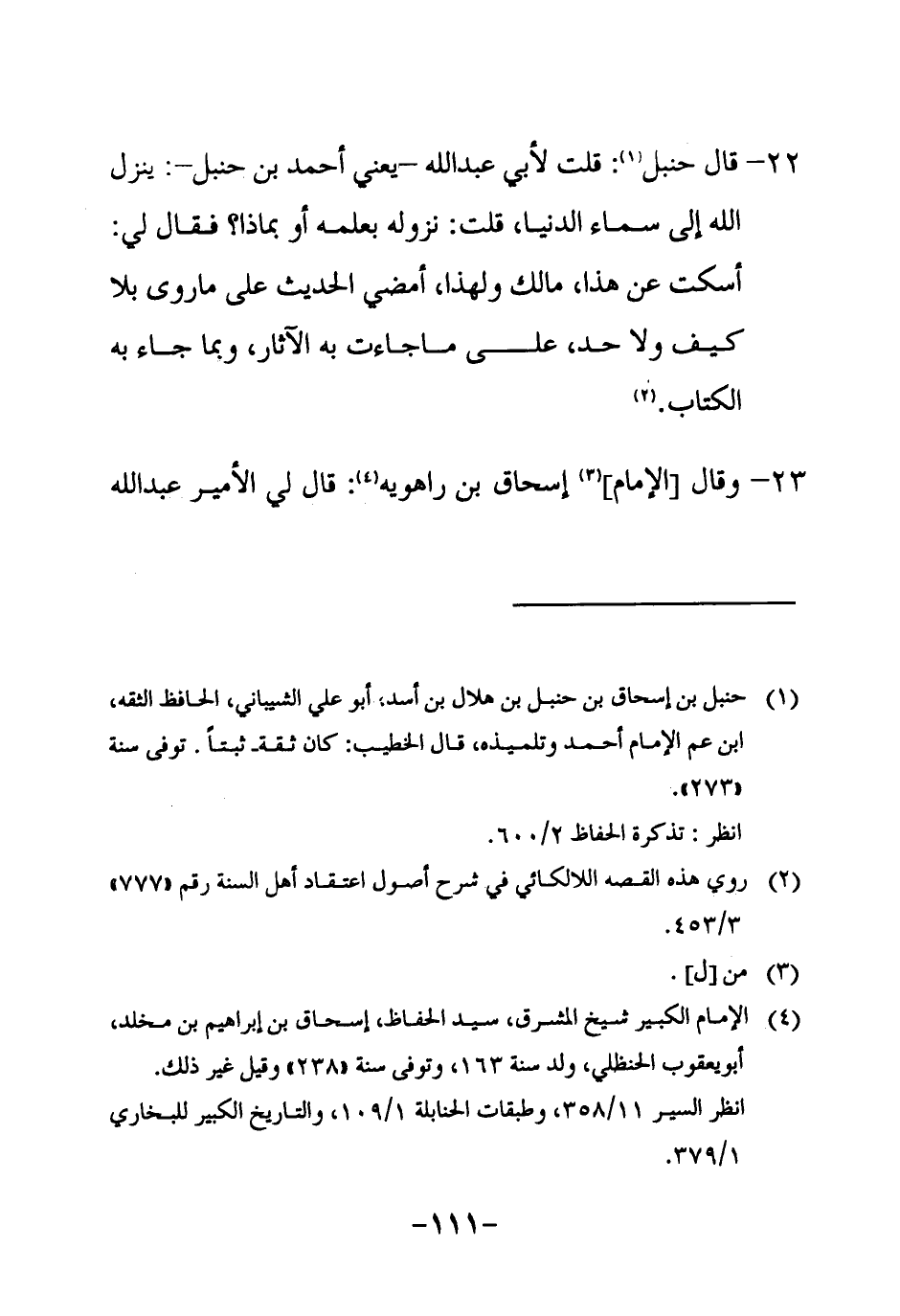 22 ـ قال حنبل1: قلت لأبي عبد الله ـ يعني أحمد بن حنبل ـ ينزل الله إلى سماء الدنيا، قلت: نزوله بعلمه أو بماذا؟ فقال لي: اسكت عن هذا، مالك ولهذا، أمضي الحديث على ما روى بلا كيف ولا حد، على ما جاءت به الآثار، وبما جاء به الكتاب2.