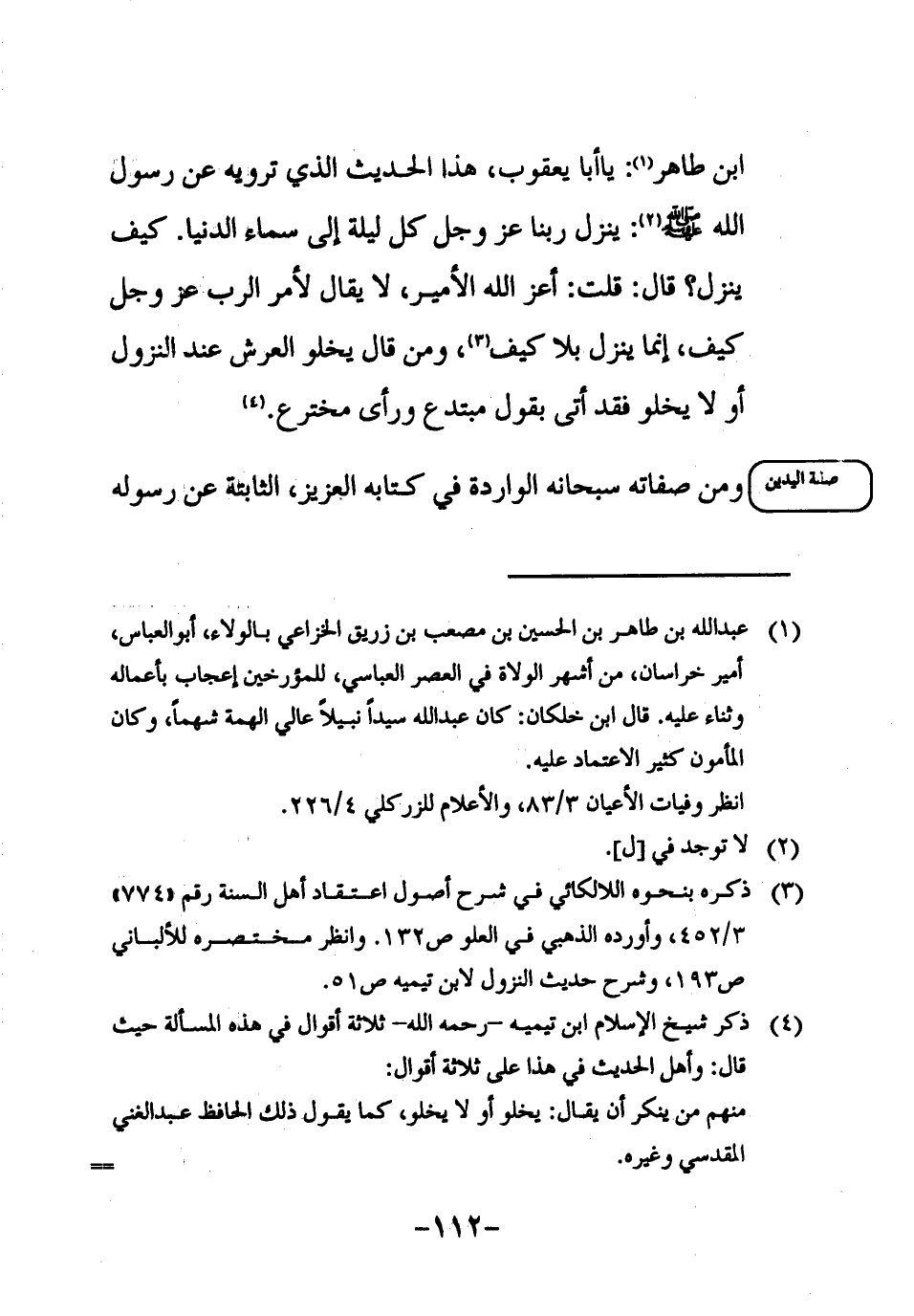 ابن طاهر1: يا أبا يعقوب، هذا الحديث الذي ترويه عن رسول الله صلى الله عليه وسلم2: ينزل ربنا عز وجل كل ليلة إلى سماء الدنيا. كيف ينزل؟ قال: قلت: أعز الله الأمير، لا يقال لأمر الرب عز وجل كيف، إنما ينزل بلا كيف3، ومن قال يخلو العرش عند النزول أو لا يخلو فقد أتى بقول مبتدع ورأى مخترع4.