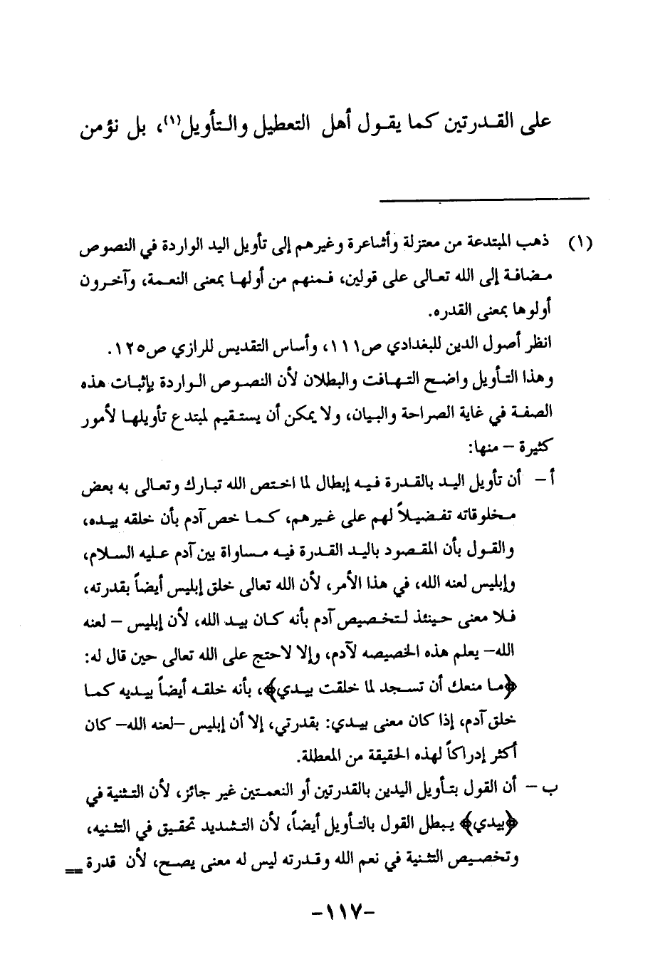 ب ـ أن القول بتأويل اليدين بالقدرتين أو النعمتين غير جائز، لأن التثنية في {بِيَدَيّ} يبطل القول بالتأويل أيضاً، لأن التشديد تحقيق في التثنية، وتخصيص التثنية في نعم الله وقدرته ليس له معنى يصح، لأن قدرة الله واحدة لا حدود لها، ونعمه كثيرة لا تحصى، فلا يصح تأويل {بِيَدَيّ} بقدرتي أو بنعمتي، لعدم جواز انحصار قدرة الله ونعمه في عدد.
