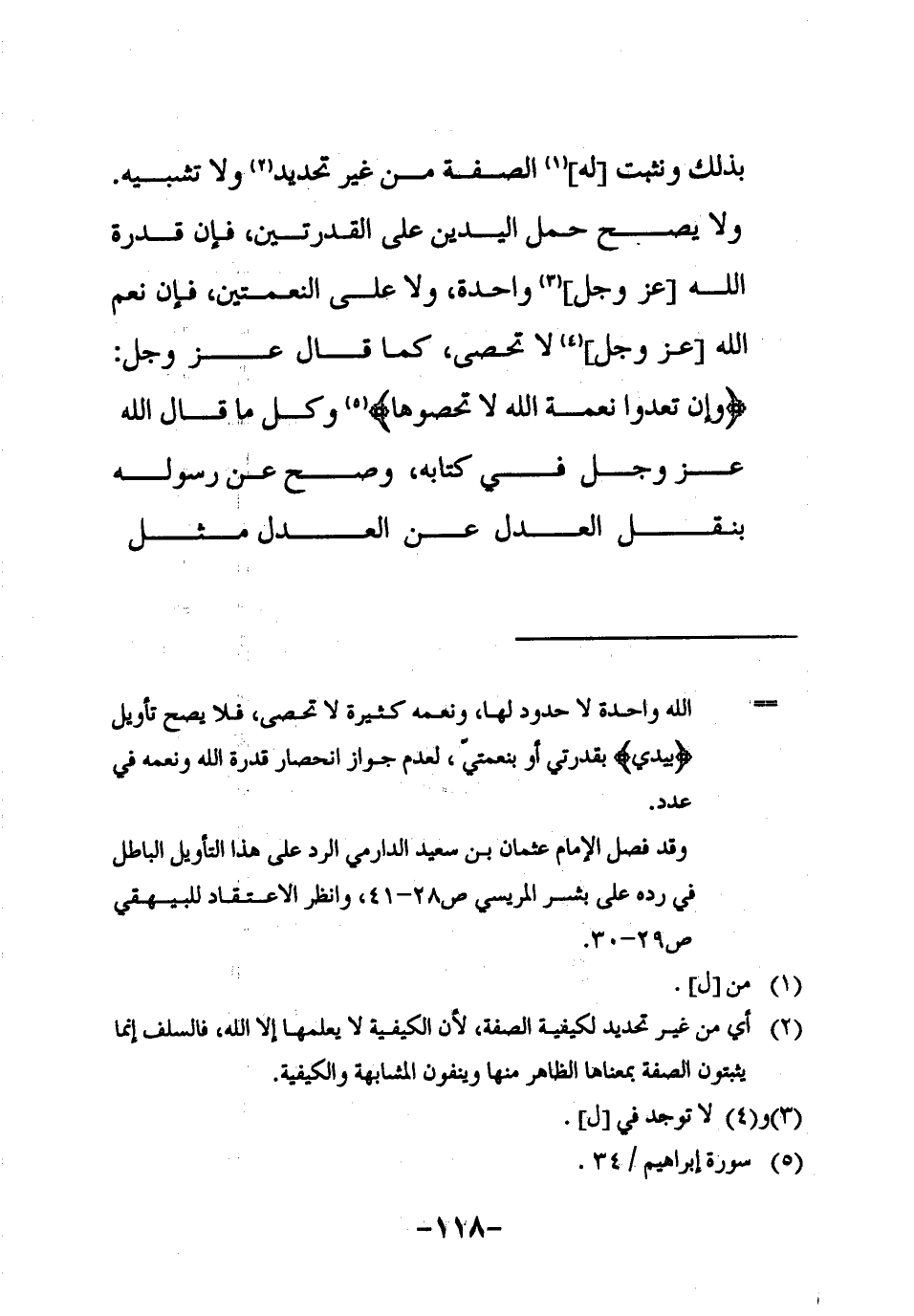 بذلك ونثبت [له] 1 الصفة من غير تحديد2 ولا تشبيه. ولا يصح حمل اليدين على القدرتين، فإن قدرة الله [عز وجل] 3 واحدة، ولا على النعمتين، فإن نعم الله [عز وجل] 4 لا تحصى، كما قال عز وجل: {وَإِنْ تَعُدُّوا نِعْمَتَ اللَّهِ لا تُحْصُوهَا} 5 وكل ما قال الله عز وجل في كتابه، وصح عن رسوله بنقل العدل عن العدل مثل