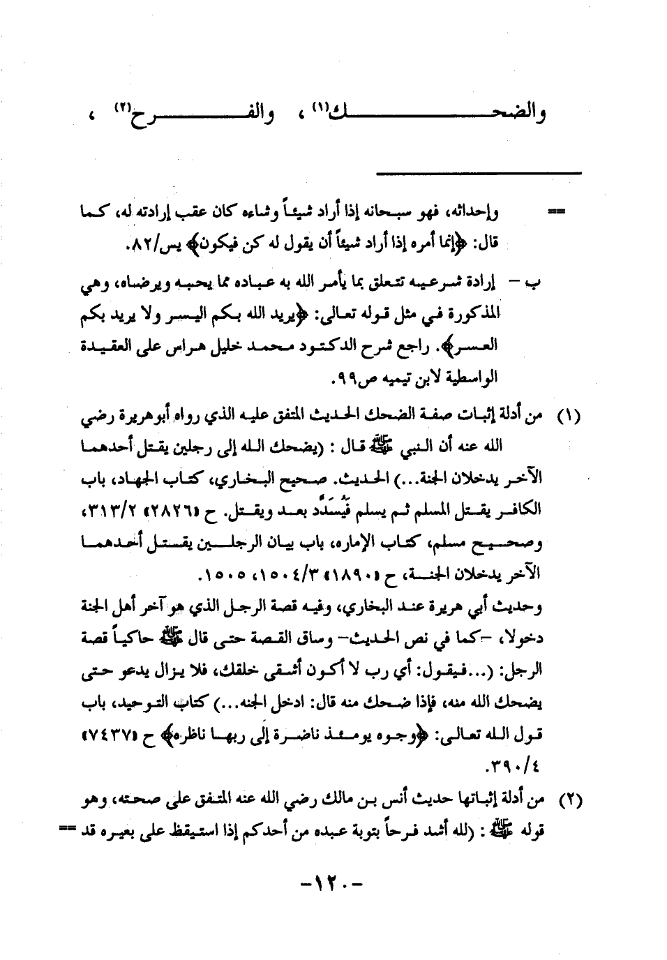 1 من أدلة إثبات صفة الضحك الحديث المتفق عليه الذي رواه أبو هريرة رضي الله عنه أن النبي صلى الله عليه وسلم قال: " يضحك الله إلى رجلين يقتل أحدهما الآخر يدخلان الجنة …" الحديث. صحيح البخاري، كتاب الجهاد، باب الكافر يقتل المسلم ثم يسلم فَيُسَدَّد بعد ويقتل. ح ((2826)) 2/313، وصحيح مسلم، كتاب الإمارة، باب بيان الرجلين يقتل أحدهما الآخر يدخلان الجنة، ح ((1890)) 3/1504،1505.
