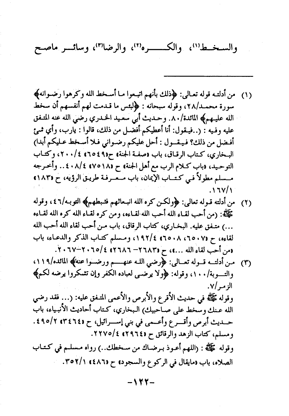 3 من أدلته قوله تعالى: {رَضِيَ اللَّهُ عَنْهُمْ وَرَضُوا عَنْهُ} المائدة/ 119، والتوبة/ 100، وقوله: {وَلا يَرْضَى لِعِبَادِهِ الْكُفْرَ وَإِنْ تَشْكُرُوا يَرْضَهُ لَكُمْ} الزمر/ 7.