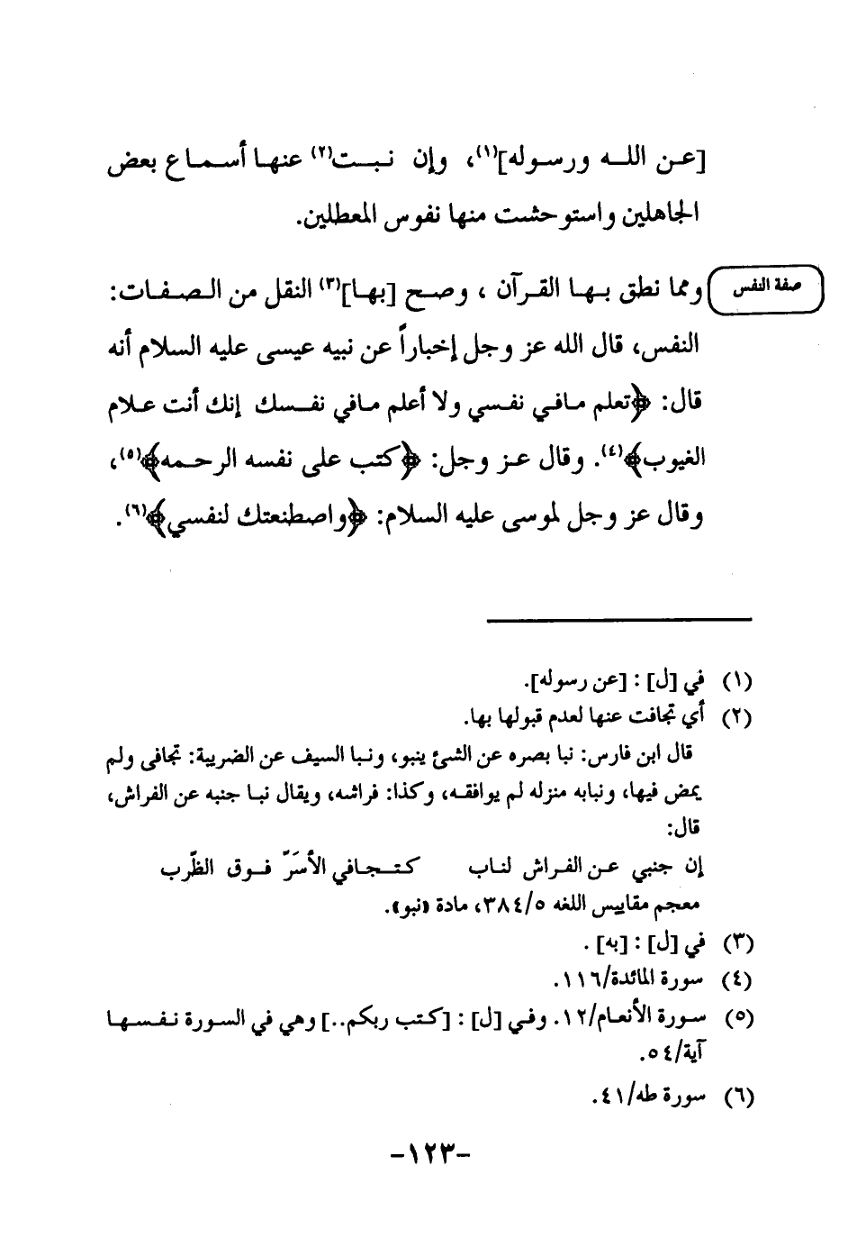 ومما نطق بها القرآن، وصح [بها] 3 النقل من الصفات: النفس، قال الله عز وجل إخباراً عن نبيه عيسى عليه السلام أنه قال: {ُ تَعْلَمُ مَا فِي نَفْسِي وَلا أَعْلَمُ مَا فِي نَفْسِكَ إِنَّكَ أَنْتَ عَلاّمُ الْغُيُوبِ} 4. وقال عز وجل: {كَتَبَ عَلَى نَفْسِهِ الرَّحْمَةَ} 5، وقال عز وجل لموسى عليه السلام: {وَاصْطَنَعْتُكَ لِنَفْسِي} 6.