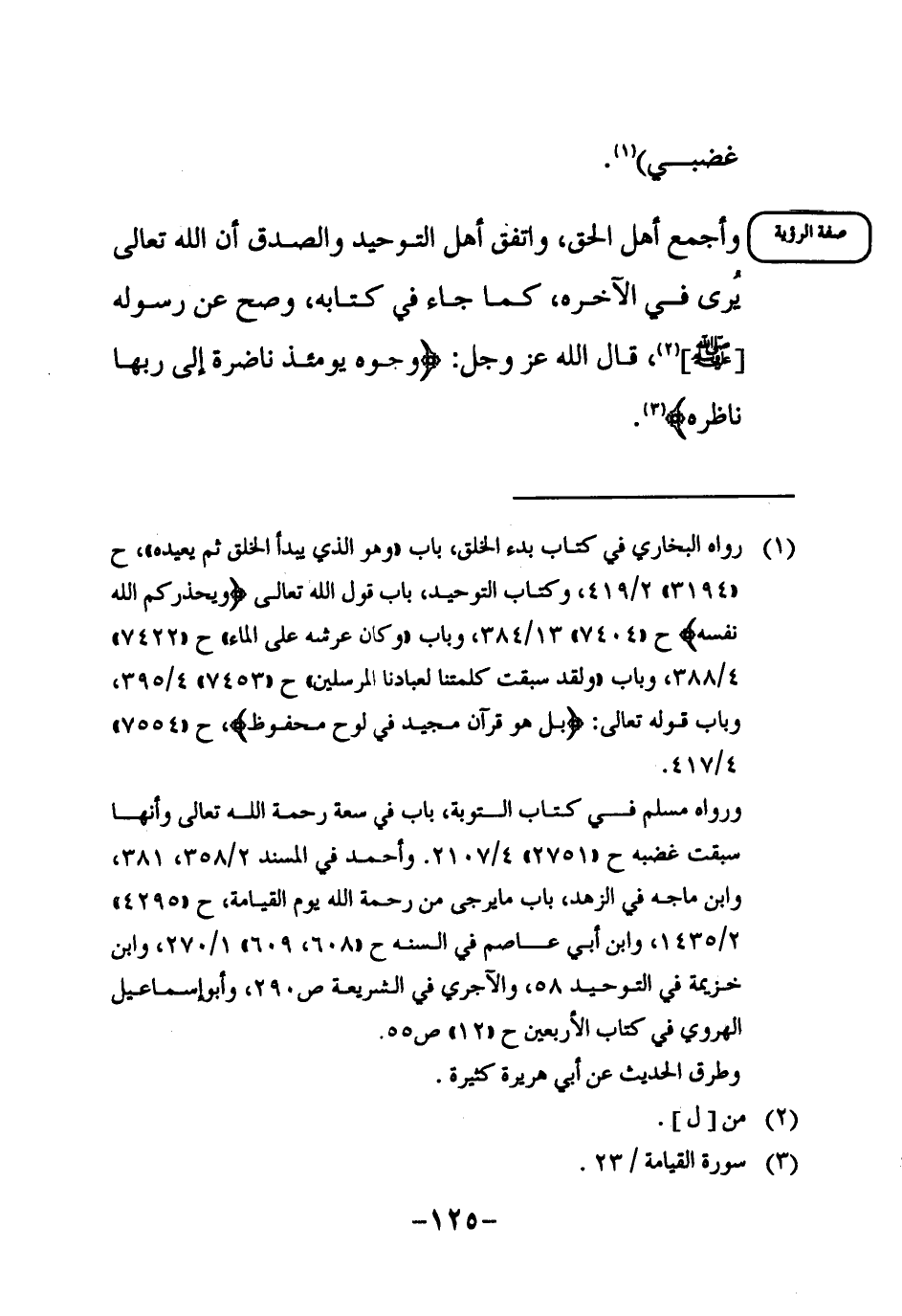 وأجمع أهل الحق واتفق أهل التوحيد والصدق أن الله تعالى يُرى في الآخرة، كما جاء في كتابه، وصح عن رسوله [صلى الله عليه وسلم] 2، قال الله عز وجل: {وُجُوهٌ يَوْمَئِذٍ نَاضِرَةٌ إِلَى رَبِّهَا نَاظِرَةٌ} 3.
