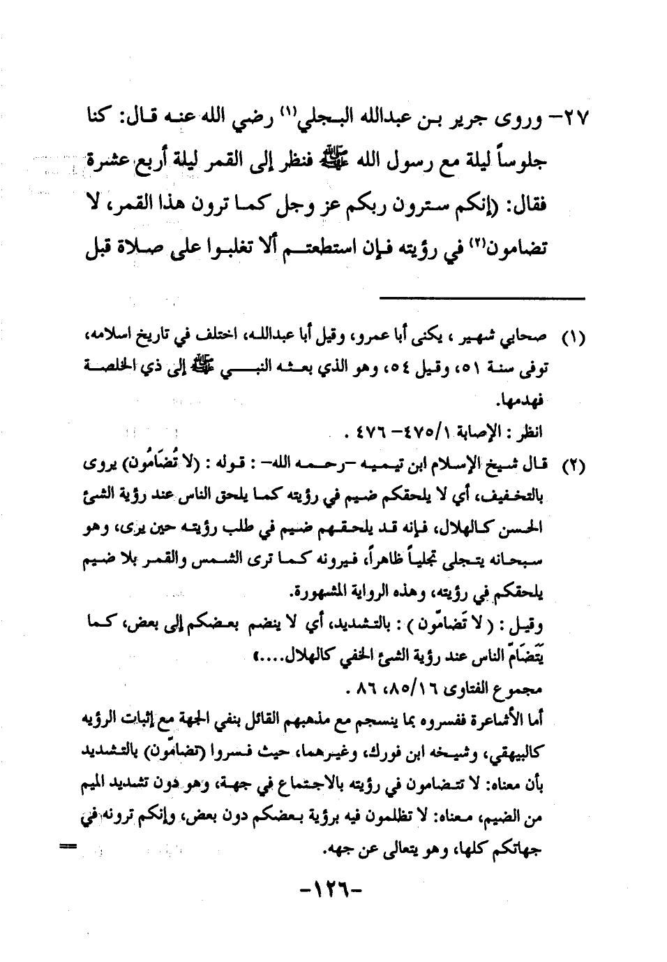 27 ـ وروى جرير بن عبد الله البجلي1 رضي الله عنه قال: كنا جلوساً ليلة مع رسول الله صلى الله عليه وسلم فنظر إلى القمر ليلة أربع عشرة فقال: " إنكم سترون ربكم عز وجل كما ترون هذا القمر، لا تضامون 2 في رؤيته فإن استطعتم ألا تغلبوا على صلاة قبل