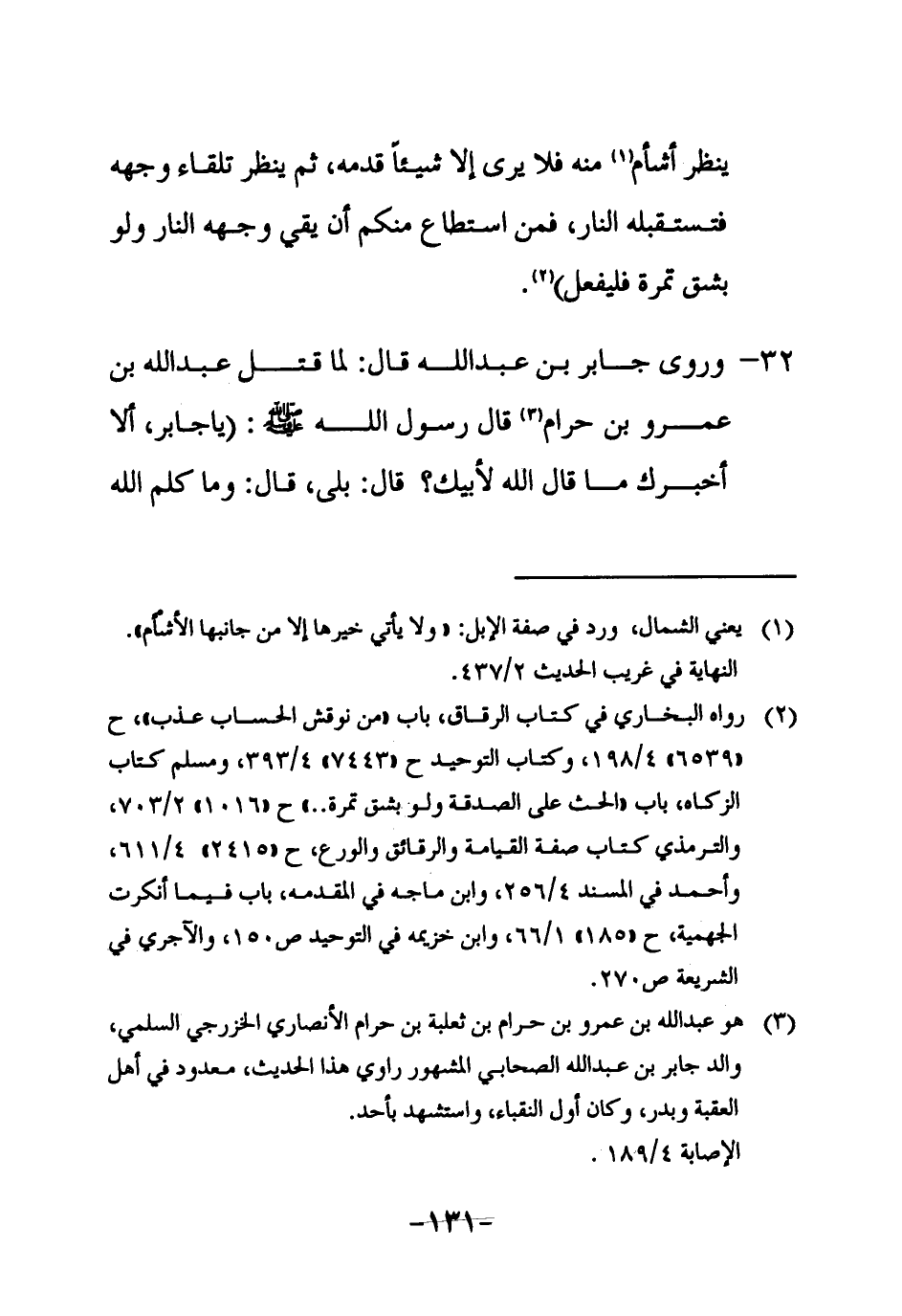 3 هو عبد الله بن عمرو بن حرام بن ثعلبة بن حرام الأنصاري الخزرجي السلمي، والد جابر بن عبد الله الصحابي المشهور راوي هذا الحديث، معدود في أهل العقبة وبدر، وكان أول النقباء واستشهد بأحد.