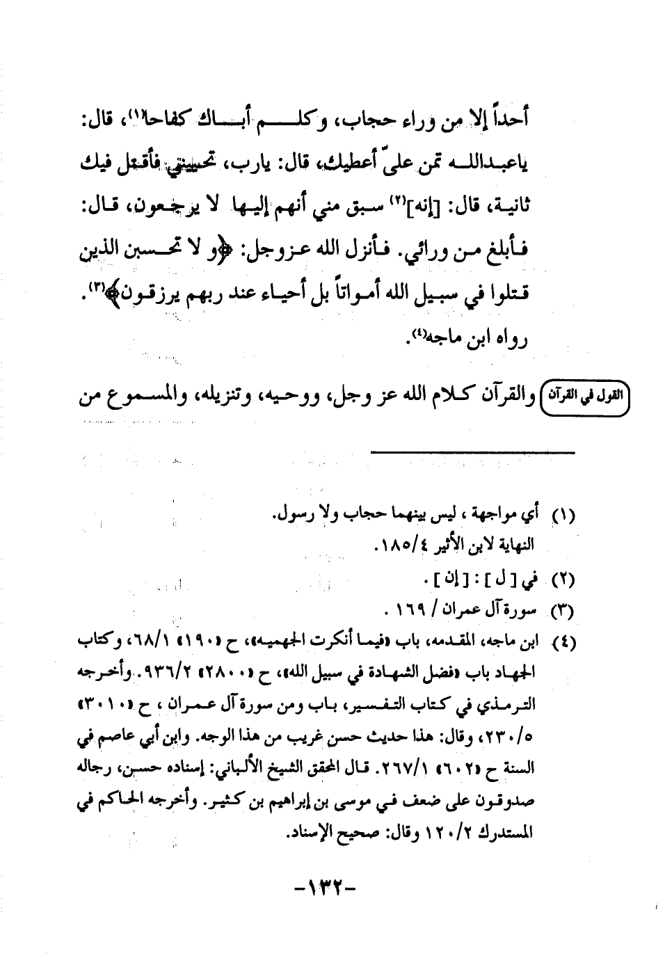أحداً إلا من وراء حجاب، وكلم أباك كفاحاً1، قال: يا عبد الله تمن عليّ أعطيك، قال: يارب، تحييني فأقتل فيك ثانية، قال: [إنه] 2 سبق مني أنهم إليها لا يرجعون، قال: فأبلغ من ورائي. فأنزل الله عز وجل: {وَلا تَحْسَبَنَّ الَّذِينَ قُتِلُوا فِي سَبِيلِ اللَّهِ أَمْوَاتاً بَلْ أَحْيَاءٌ عِنْدَ رَبِّهِمْ يُرْزَقُونَ} 3. رواه ابن ماجه4.