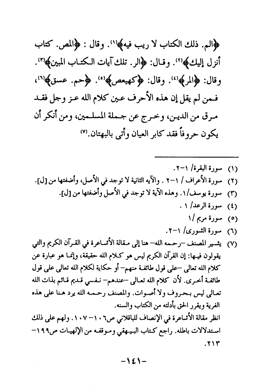 {الم ذَلِكَ الْكِتَابُ لا رَيْبَ فِيهِ} 1. وقال: {المص كِتَابٌ أُنْزِلَ إِلَيْكَ} 2. وقال: {الر تِلْكَ آيَاتُ الْكِتَابِ الْمُبِينِ} 3. وقال: {المر} 4. وقال: {كهيعص} 5. {حم عسق} 6، فمن لم يقل إن هذه الأحرف عين كلام الله عز وجل فقد مرق من الدين، وخرج عن جملة المسلمين، ومن أنكر أن يكون حروفاً فقد كابر العيان وأتى بالبهتان7.