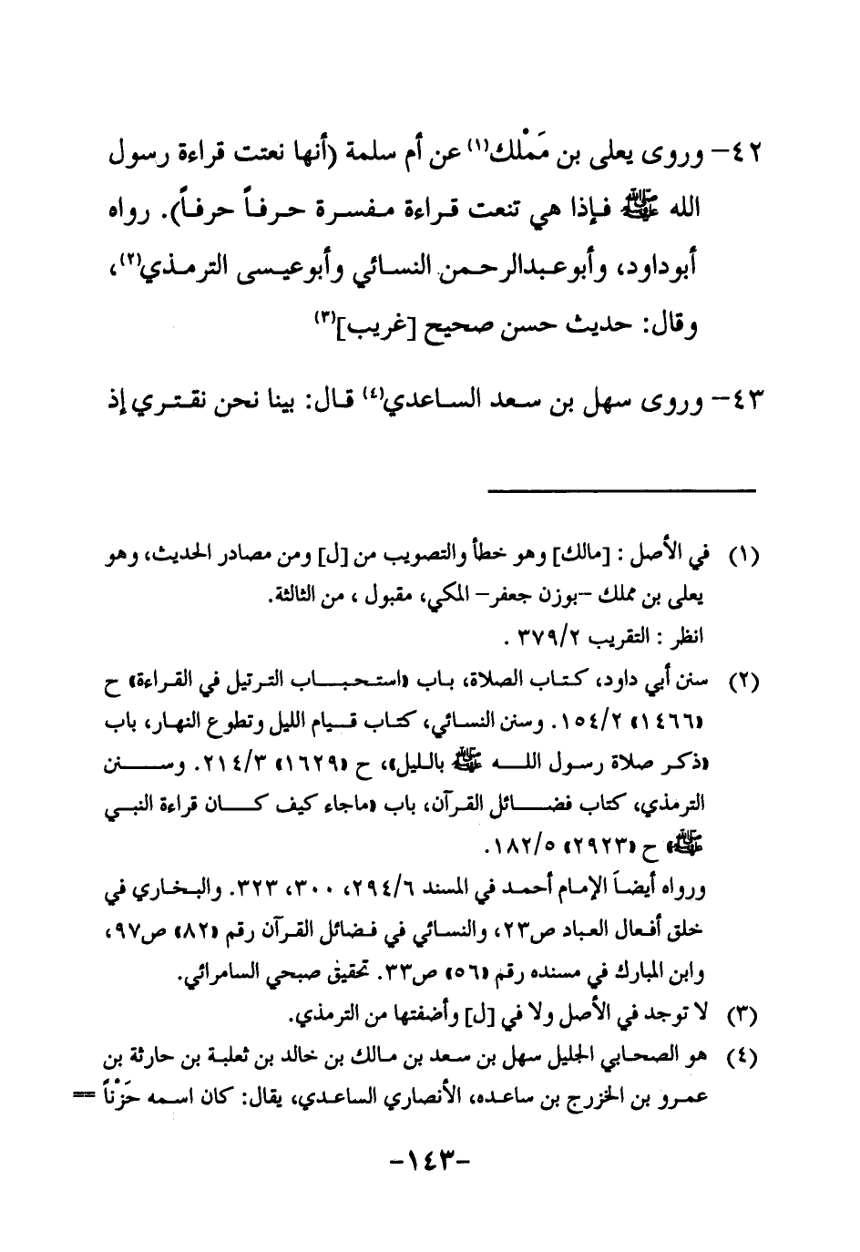 42 ـ وروى يعلى بن مَمْلك1 عن أم سلمة " أنها نعتت قراءة رسول الله صلى الله عليه وسلم فإذا هي تنعت قراءة مفسرة حرفاً حرفاً ". رواه أبو داود، وأبو عبد الرحمن النسائي وأبو عيسى الترمذي2، وقال: حديث حسن صحيح [غريب] 3.