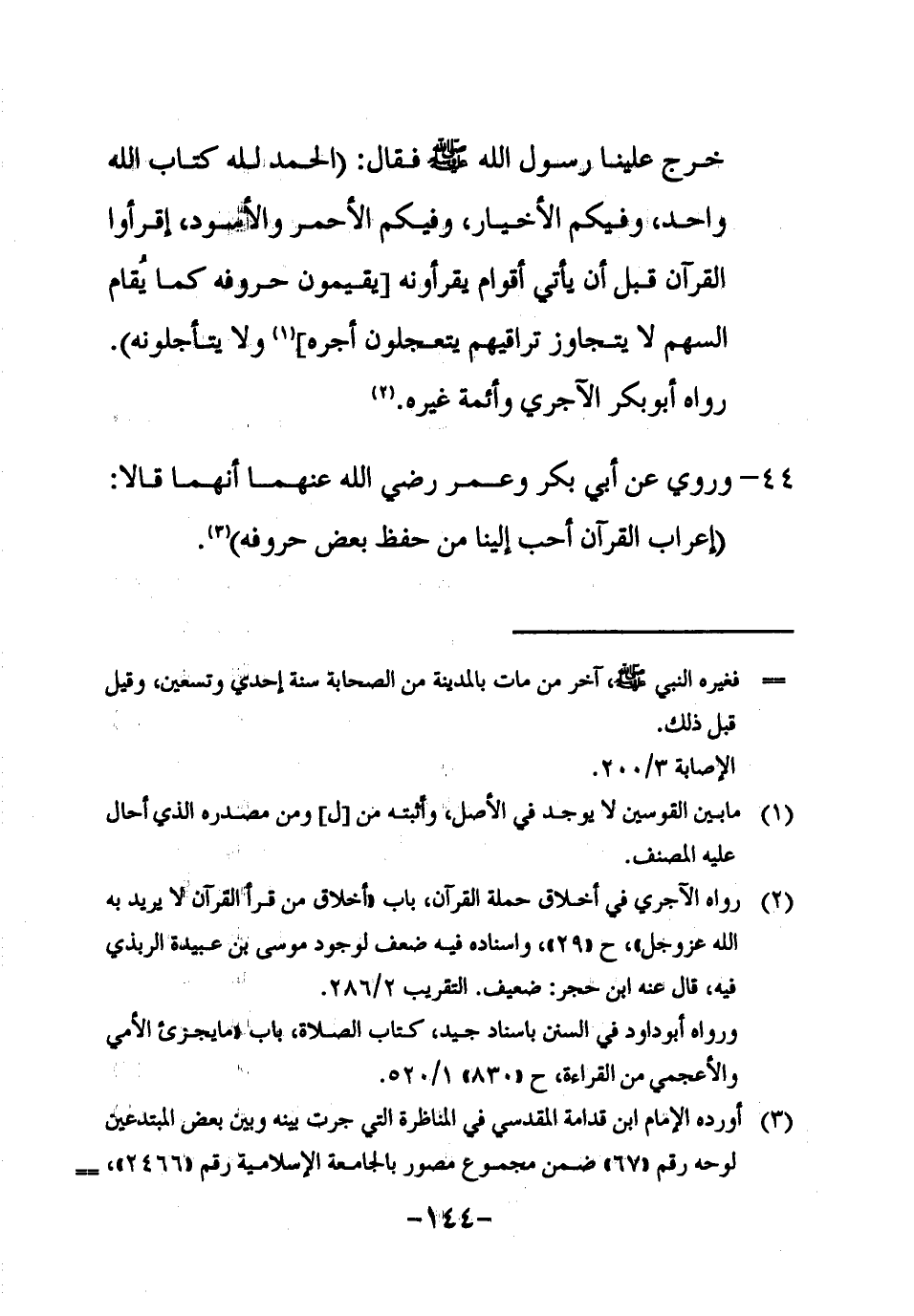 44 ـ وروي عن أبي بكر وعمر رضي الله عنهما أنهما قالا: " إعراب القرآن أحب إلينا من حفظ بعض حروفه "3.