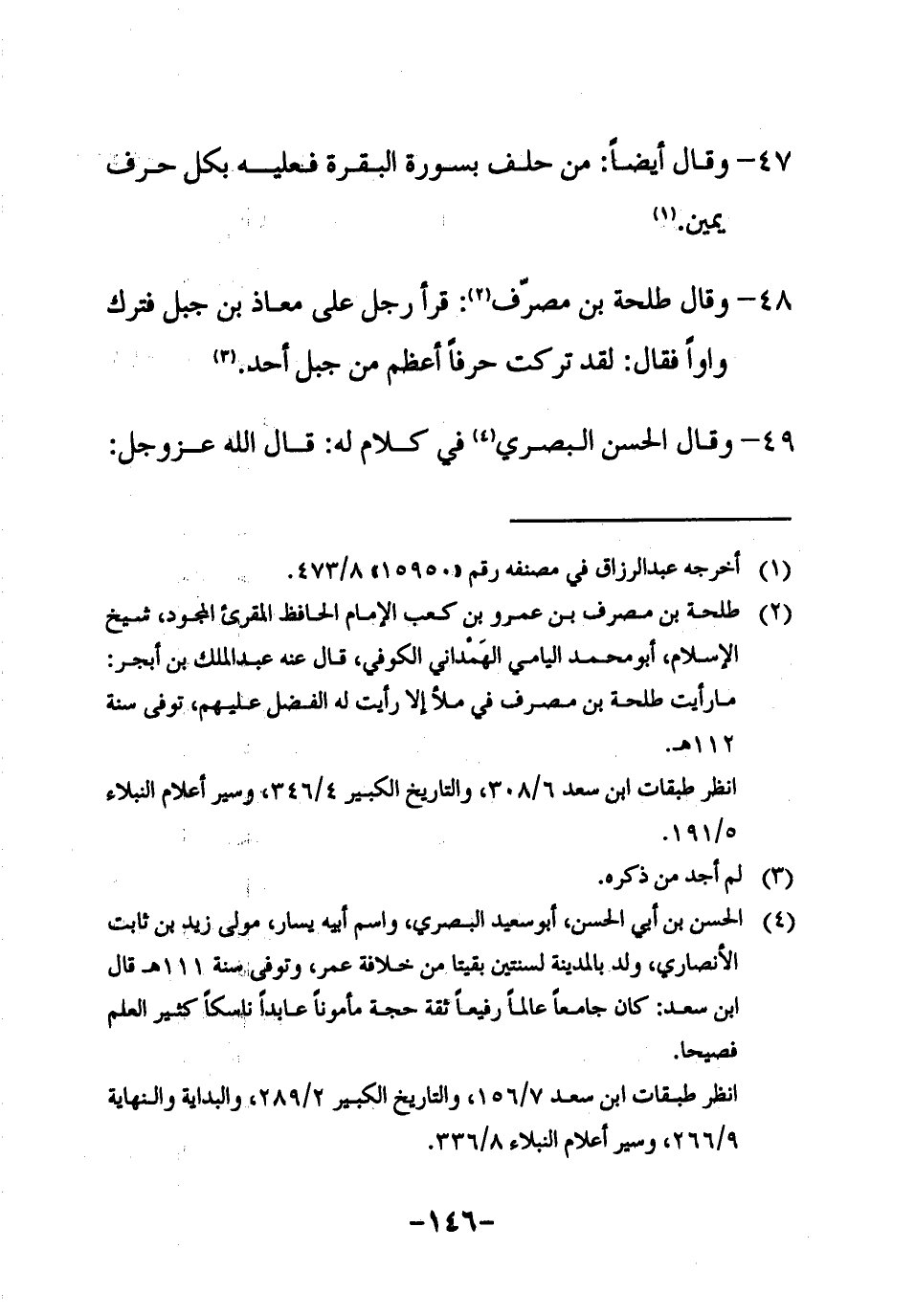 48 ـ وقال طلحة بن مصرّف2: قرأ رجل على معاذ بن جبل فترك واواً فقال: لقد تركت حرفاً أعظم من جبل أحد3.