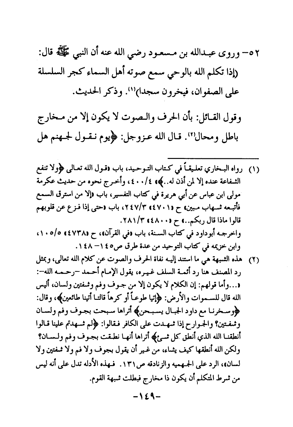 52 ـ وروى عبد الله بن مسعود رضي الله عنه أن النبي صلى الله عليه وسلم قال: " إذا تكلم الله بالوحي سمع صوته أهل السماء كجر السلسلة على الصفوان، فيخرون سجداً " 1. وذكر الحديث.