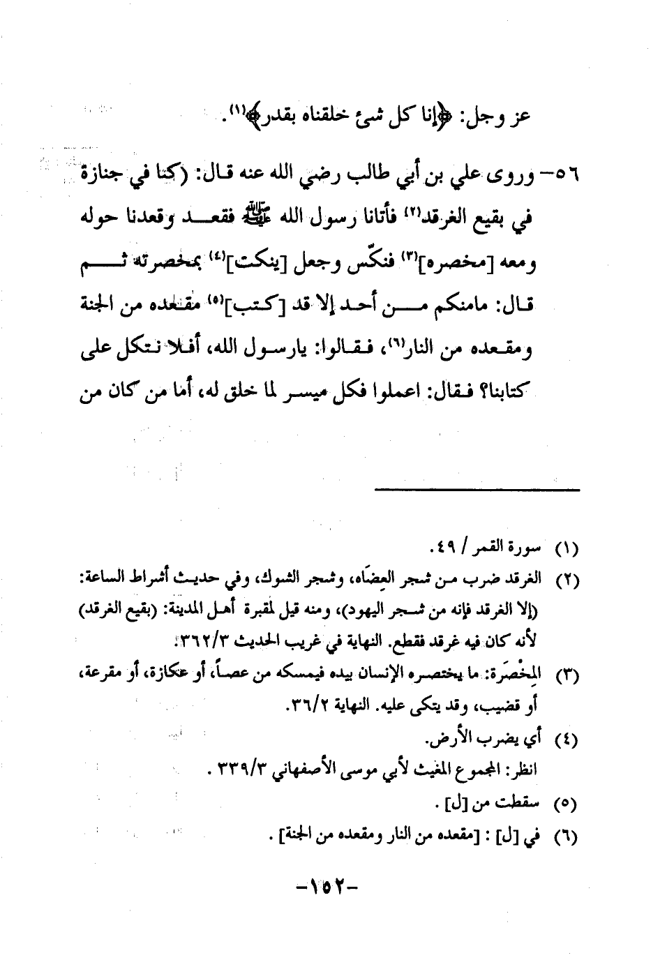 56 ـ وروى علي بن أبي طالب رضي الله عنه قال: " كنا في جنازة في بقيع الغرقد2 فأتانا رسول الله صلى الله عليه وسلم فقعد وقعدنا حوله ومعه [مخصره] 3 فنكّس وجعل [ينكت] 4 بمخصرته ثم قال: "ما منكم من أحد إلا قد [كتب] 5 مقعده من الجنة ومقعده من النار6"، فقالوا: يا رسول الله، أفلا نتكل على كتابنا؟ فقال: "اعملوا فكل ميسر لما خلق له، أما من كان من