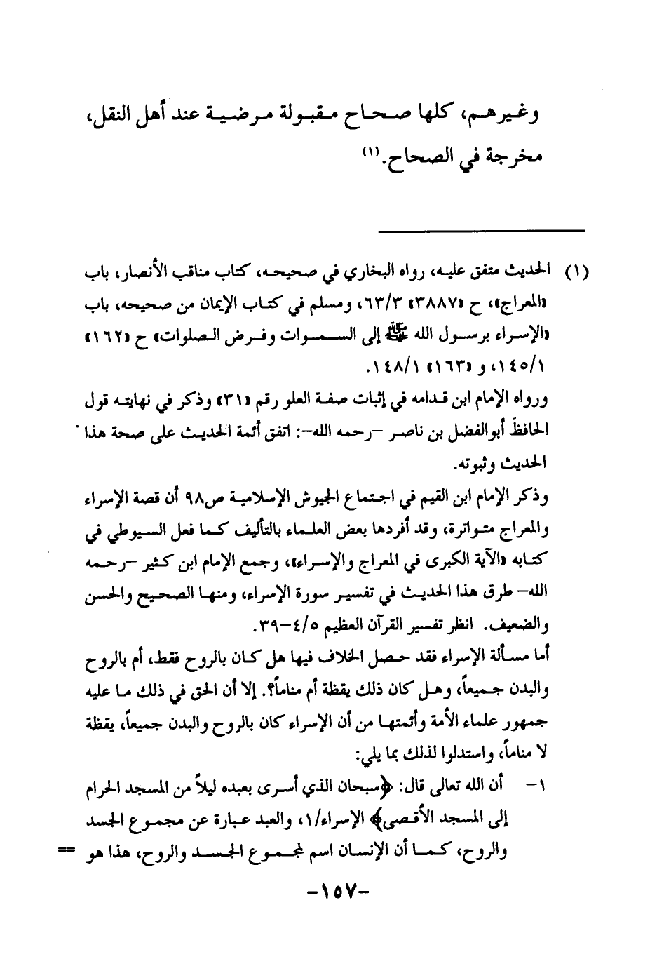 1 ـ أن الله تعالى قال: {سُبْحَانَ الَّذِي أَسْرَى بِعَبْدِهِ لَيْلاً مِنَ الْمَسْجِدِ الْحَرَامِ إِلَى الْمَسْجِدِ الْأَقْصَى} الإسراء/1، والعبد عبارة عن مجموع الجسد والروح، كما أن الإنسان اسم لمجموع الجسد والروح، هذا هو المعروف عند الإطلاق، وهو الصحيح، فيكون الإسراء بهذا المجموع.