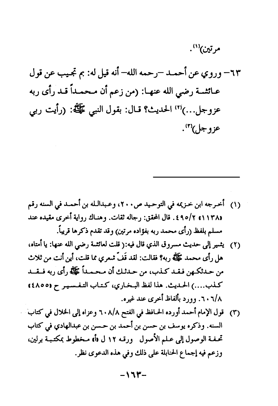 63 ـ وروي عن أحمد ـ رحمه الله ـ أنه قيل له: بم تجيب عن قول عائشة رضي الله عنها: " من زعم أن محمداً قد رأى ربه عز وجل …"2 الحديث؟ قال: بقول النبي صلى الله عليه وسلم: " رأيت ربي عز وجل " 3.