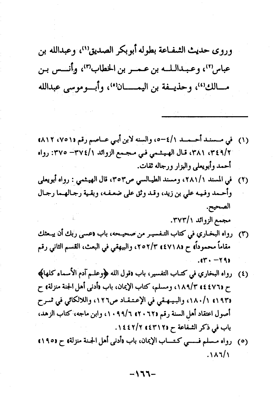 وروى حديث الشفاعة بطوله أبو بكر الصديق1، وعبد الله بن عباس2، وعبد الله بن عمر بن الخطاب3، وأنس بن مالك4، وحذيفة بن اليمان5، وأبو موسى عبد الله