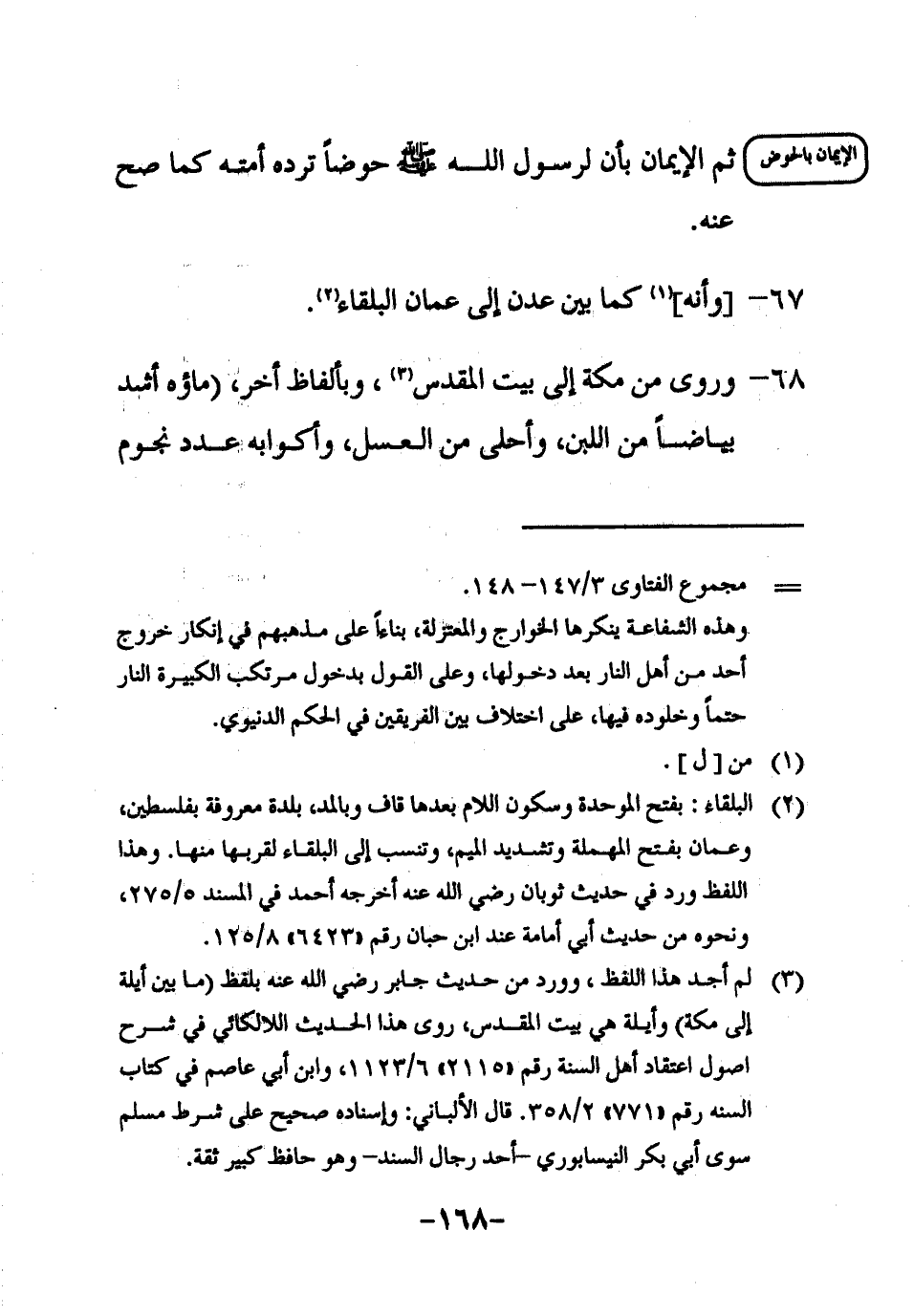 68 ـ وروى من مكة إلى بيت المقدس3، وبألفاظ أخر، " ماؤه أشد بياضاً من اللبن، وأحلى من العسل، وأكوابه عدد نجوم