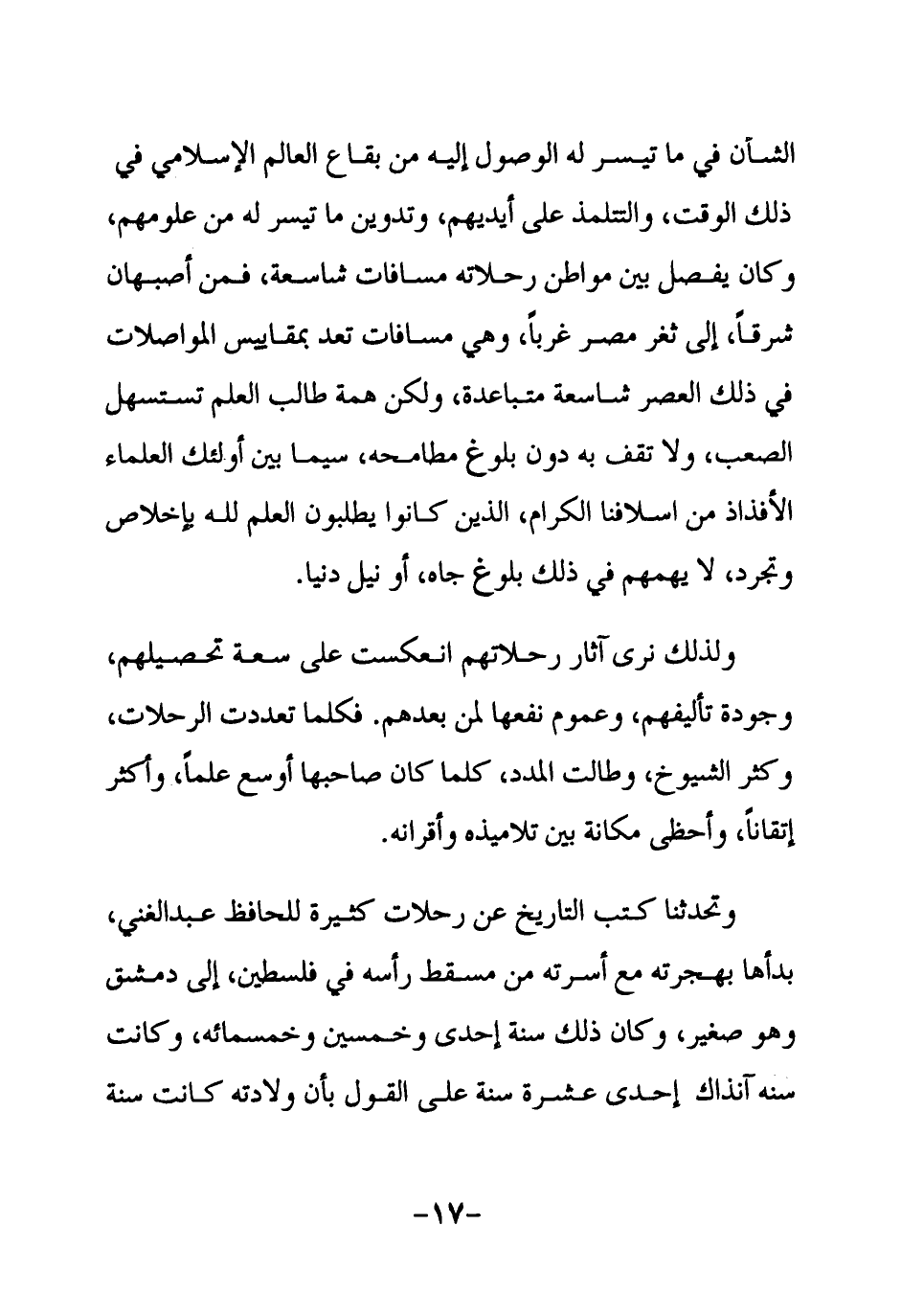 الشأن في ما تيسر له الوصول إليه من بقاع العالم الإسلامي في ذلك الوقت، والتتلمذ على أيديهم، وتدوين ما تيسر له من علومهم، وكان يفصل بين مواطن رحلاته مسافات شاسعة، فمن أصبهان شرقاً، إلى ثغر مصر غرباً، وهي مسافات تعد بمقاييس المواصلات في ذلك العصر شاسعة متباعدة، ولكن همة طالب العلم تستسهل الصعب، ولا تقف به دون بلوغ مطامحه، سيما بين أولئك العلماء الأفذاذ من أسلافنا الكرام، الذين كانوا يطلبون العلم لله بإخلاص وتجرد، لا يهمهم في ذلك بلوغ جاه، أو نيل دنيا.
